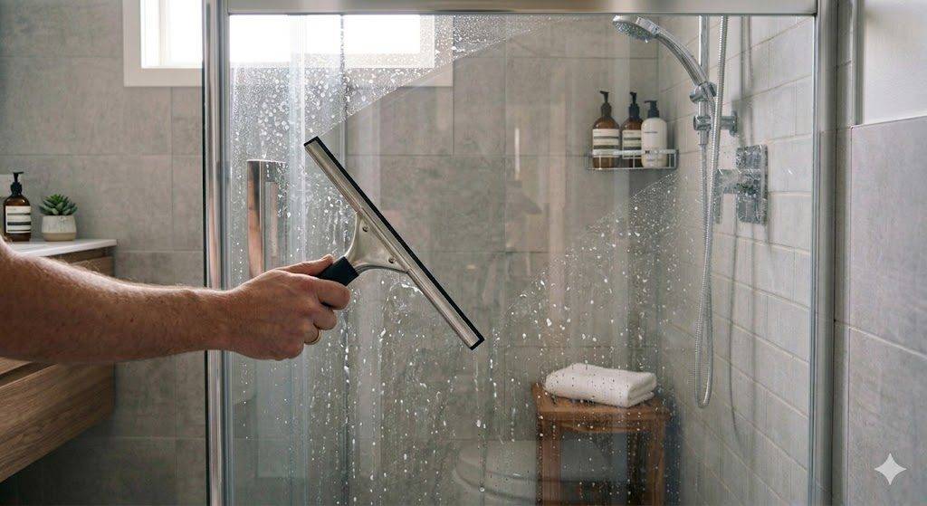 每次沐浴後用玻璃刮刀輕輕刮去玻璃上的水滴,這樣能有效減少水垢的形成。同時,也可以考慮使用防水噴霧,讓玻璃表面更具防水效果,避免水漬殘留。