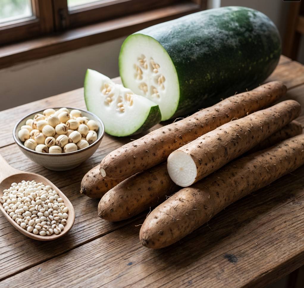 材料:生薏米15g、茯苓15g、白扁豆15g、瘦肉300g、陳皮1小塊。