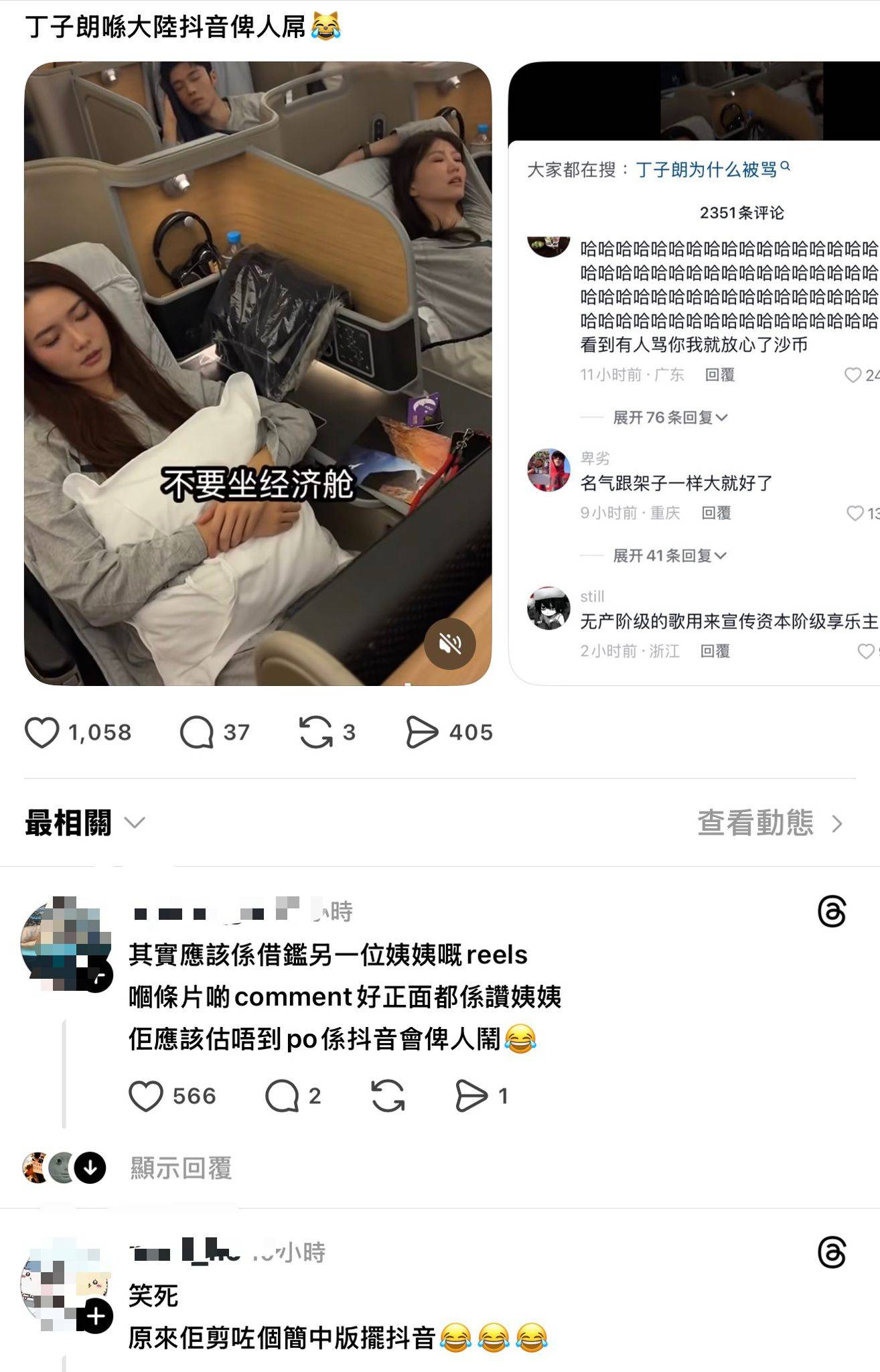 消息傳回香港後,連登及Threads等平台同樣掀起熱烈討論。有香港網民幸災樂禍地留言「丁子朗喺大陸抖音俾人鬧😹」,更有人直接批評「啲奀星要靠搭business class擦存在感」。不少網民更進一步質疑丁子朗的言論涉嫌歧視。有香港網民直言「已經歧視咗坐Econ嘅人,明星好巴閉咩,睇你幾時坐番Econ」,認為他的說法帶有明顯的階級歧視色彩。另有網民建議「唔好咁寫’Don’t fly economy’,否則你好似歧視或者睇唔起坐econ嘅朋友」,指出這種表達方式容易傷害其他人的感受。更有網民諷刺「以為坐business就真係好有錢」、「Econ有咁大嘅咩?睇你都你公司sponsor啫」,質疑他是否真的有實力長期搭乘商務艙。