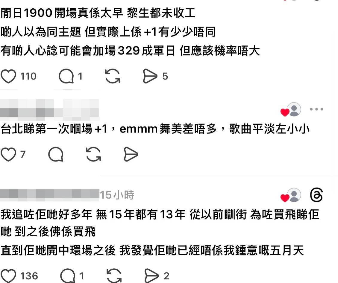 「年年都開,悶到嘔」成為網民的共同心聲,有人批評「開九十幾次都唔整啲新歌,勁冇誠意地食老本」。五月天近年來頻繁舉辦演唱會,但新作品產量卻大幅減少,令歌迷感到失望。「2026年仲有人睇五月天?」的質疑聲此起彼伏,反映出部分樂迷已經對樂隊失去信心。