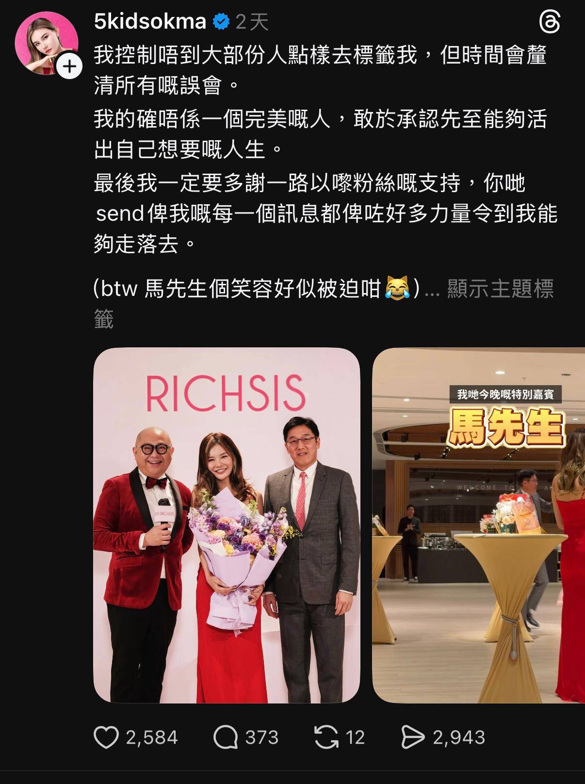 五索昨日(13日)在IG分享公司春茗的熱鬧盛況,身穿火紅色低胸長裙的她與打扮正式的馬清鏗一同入場,這是兩人自公開關係後首次一同出席公開活動。馬清鏗更走上台接受林盛斌的訪問,當被問及平時拍片入鏡是被迫還是自願時,他微笑回應「多數都唔知」,更風趣地表示「早知著好啲啦」。整個春茗筵開數席,五索更不惜工本邀請林盛斌擔任司儀,務求讓員工玩得開心。