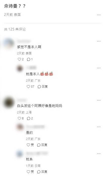 影片曝光後,不少網民紛紛留言表達質疑,有人直言「感覺不是本人啊」、「咋看出是她媽媽啊」,認為無論是外貌還是身邊的人都與印象中的佘詩曼不符。不過很快就有眼利網民提供關鍵線索,指出「白頭髮的這個阿姨好像是她媽媽」、「那個白頭髮的是佘太君吧」,並解釋佘媽媽因為之前的病情接受治療後頭髮變白,外表也有所改變。更有網民留意到佘詩曼經常穿著同一件襯衫,笑言「她怎麼老穿這件襯衫」,進一步證實確實是本人無誤。