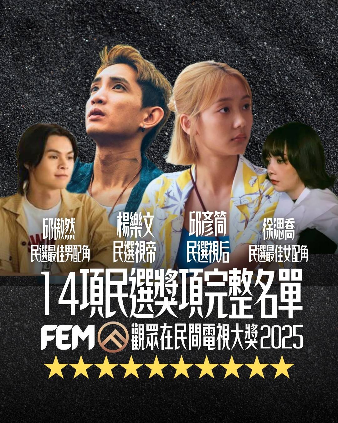 | 年度 | 民選最佳男主角 | 民選最佳女主角 | 民選最佳男配角 | 民選最佳女配角 | 民選飛躍男藝員 | 民選飛躍女藝員 |