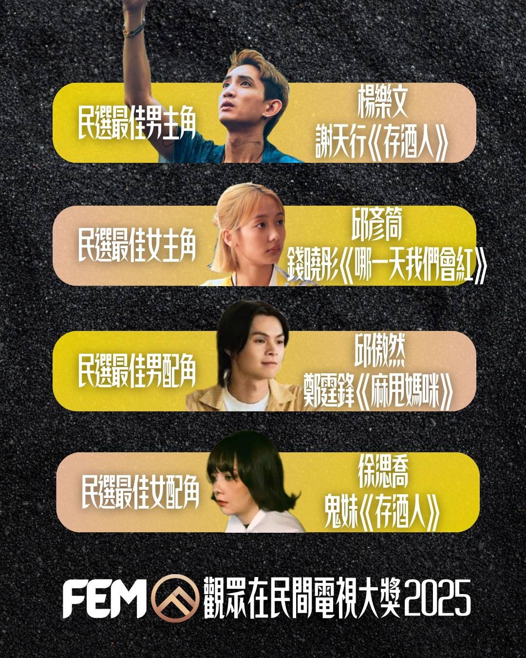 | 第十屆(2025) | 楊樂文《存酒人》(ViuTV) | 邱彥筒《哪一天我們會紅》(ViuTV) | 邱傲然《麻甩媽咪》(ViuTV) | 徐㴓喬《存酒人》(ViuTV) | 邱傲然(ViuTV) | 邱彥筒(ViuTV) |