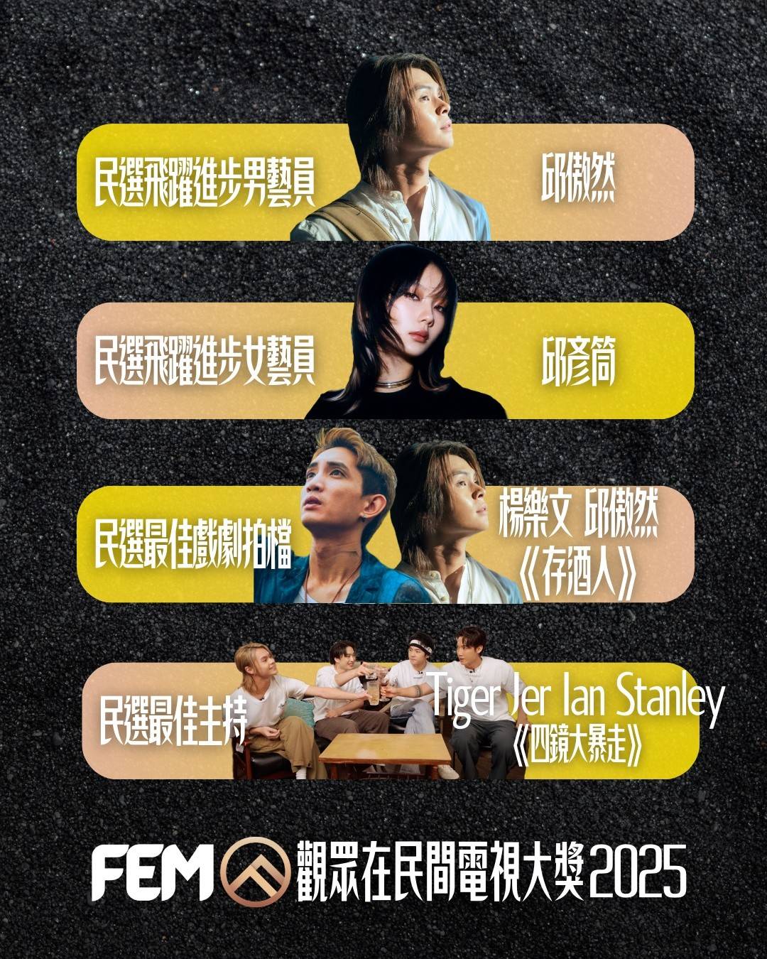 | 第十屆(2025) | 《四鏡大暴走》(ViuTV) | 《空肚講宵夜》(ViuTV) | 邱傲然、柳應廷、陳卓賢、邱士縉《四鏡大暴走》(ViuTV) |