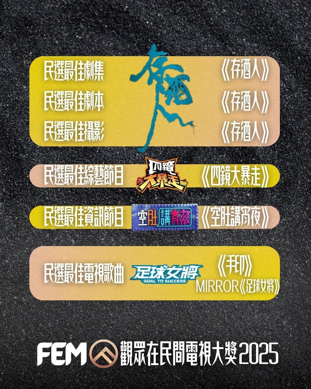 | 第十屆(2025) | 《存酒人》(ViuTV) | 《存酒人》(ViuTV) | 《存酒人》(ViuTV) |