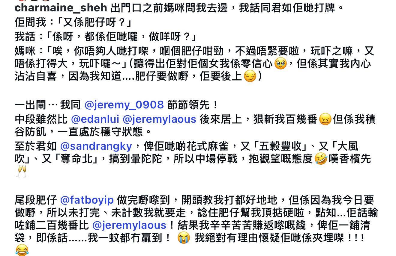尾段肥仔工作完畢趕到現場,開始時還教導佘詩曼打牌技巧。然而由於佘詩曼要趕工作提早離場,便拜託肥仔代打完成餘下牌局。豈料肥仔一上場就輸了「二百幾番」給Jeremy,令佘詩曼辛苦賺回來的錢瞬間清袋,最終「一蚊都冇贏到」。佘詩曼在貼文末段直言「絕對有理由懷疑佢哋係夾埋㗎」,語氣中帶著無奈和幽默。
