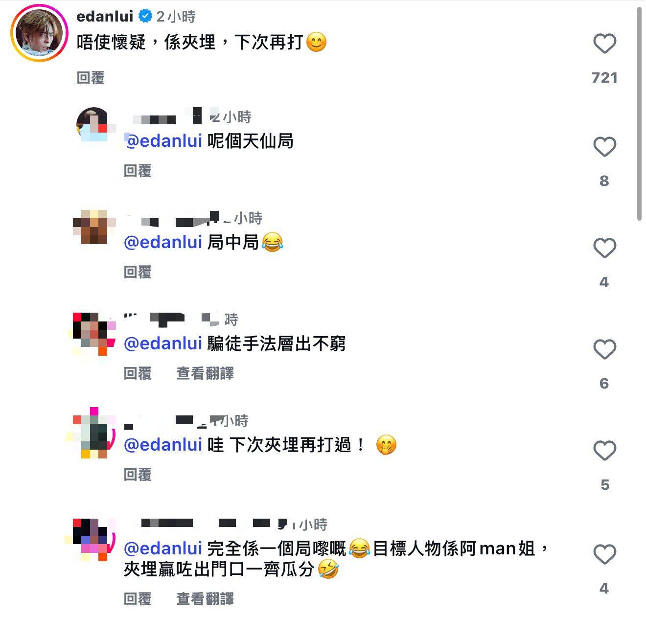 Edan在留言區大方承認「唔使懷疑,係夾埋,下次再打」,獲得674個讚好成為最高人氣回覆。網民紛紛留言調侃這是「天仙局」、「局中局」,更有人形容是「騙徒手法層出不窮」。有網民大讚佘詩曼的描述「好精彩」,亦有人建議「可以開多檯」擴大麻雀圈子。這種輕鬆幽默的互動展現了跨公司藝人間的真摯友誼,打破了不同電視台之間的界限。