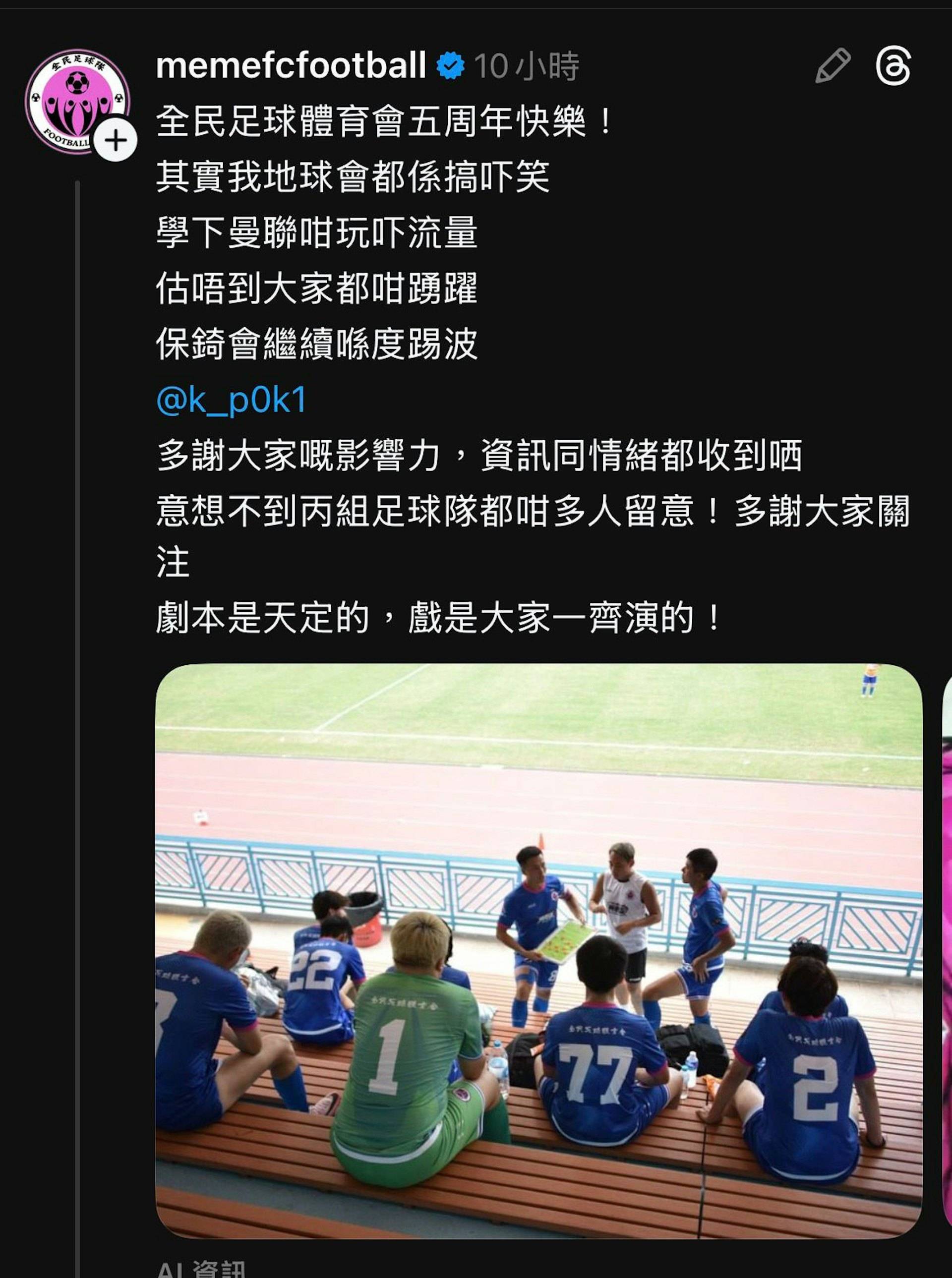 正當大家以為事件告一段落時,「全民足球體育會」竟然來個180度大轉彎!球會在慶祝五周年時突然改口,稱之前的操作純屬「搞笑」,更透露保錡將繼續留隊。球會發文表示「其實我地球會都係搞吓笑,學下曼聯咁玩吓流量,估唔到大家都咁踴躍,保錡會繼續喺度踢波」,最後更來一句「劇本是天定的,戲是大家一齊演的!」這個突如其來的「劇情反轉」立即激起網民強烈不滿,紛紛怒轟這種宣傳手法極不恰當。