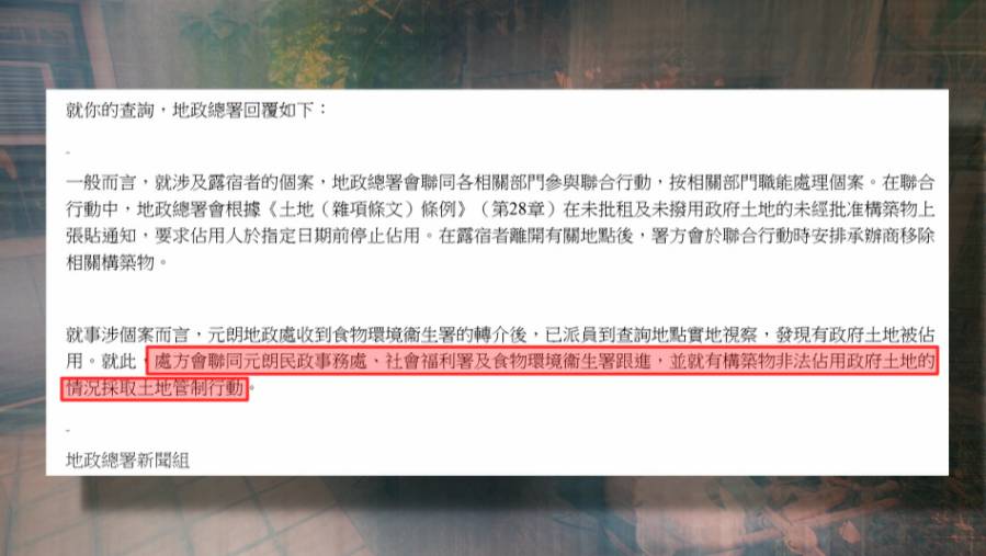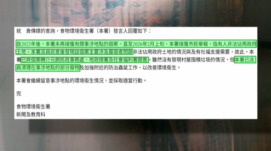 《東張西望》去信食環署查詢,回覆表示由2023年至今年2月,只收過一宗關於非法佔用政府土地的投訴。因為涉及露宿者問題,已轉介民政處、地政總署同社署跟進,食環署也派員清理部分廢物。地政署回覆《東張西望》表示,將聯同民政、社署及食環跟進,並就非法佔用採取土地管制行動。目前苦主楊先生門前雜物已被清理乾淨,但堆放政府土地的雜物仍未清走。