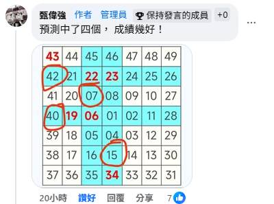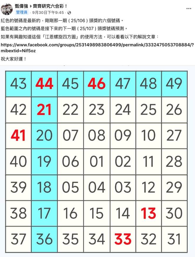 Facebook群組「齊齊研究六合彩!」群主強哥不時在社交平台分享預測頭獎號碼的方法,他早幾期曾以「江恩螺旋四方圖」成功估中第98期的4個頭獎號碼,及連續兩期(第95及96期)成功預測出3個攪珠冧把