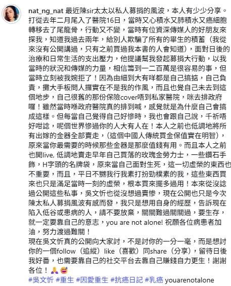 吳文忻在社交平台發文透露,過去兩年曾被欺騙畢生積蓄,令她在面對日後治療和日常生活支出時承受巨大壓力。她表示自己的舊保險未能覆蓋私家醫院費用,只能選擇排政府醫院治療,回憶當時在政府醫院排隊的經歷,她坦言「真的排到喊,感覺就是為什麼自己會搞成這樣」。儘管面對如此困境,吳文忻仍保持樂觀態度,提醒自己「千祈唔好咁諗,呢個世界慘過你的人大有人在」。