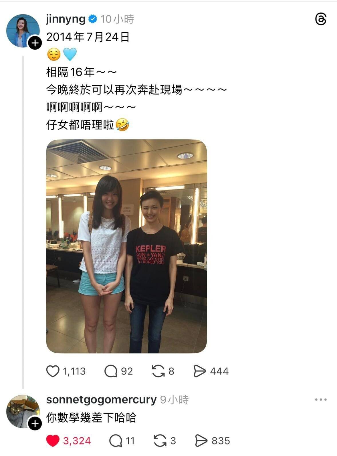 吳若希在Instagram分享這張2014年7月24日與孫燕姿的合照,配文寫道「相隔12年,今晚終於可以再次奔赴現場,啊啊啊啊啊~~~仔女都唔理啦!」照片中的她穿著短褲背著背包,雙手緊握站在偶像旁邊,顯得既興奮又緊張。當年的吳若希樣貌青澀,長腿搶眼,雖然身高明顯比孫燕姿高,但仍然一副小粉絲的羞怯模樣,與平時在鏡頭前的自然大方形成強烈對比。