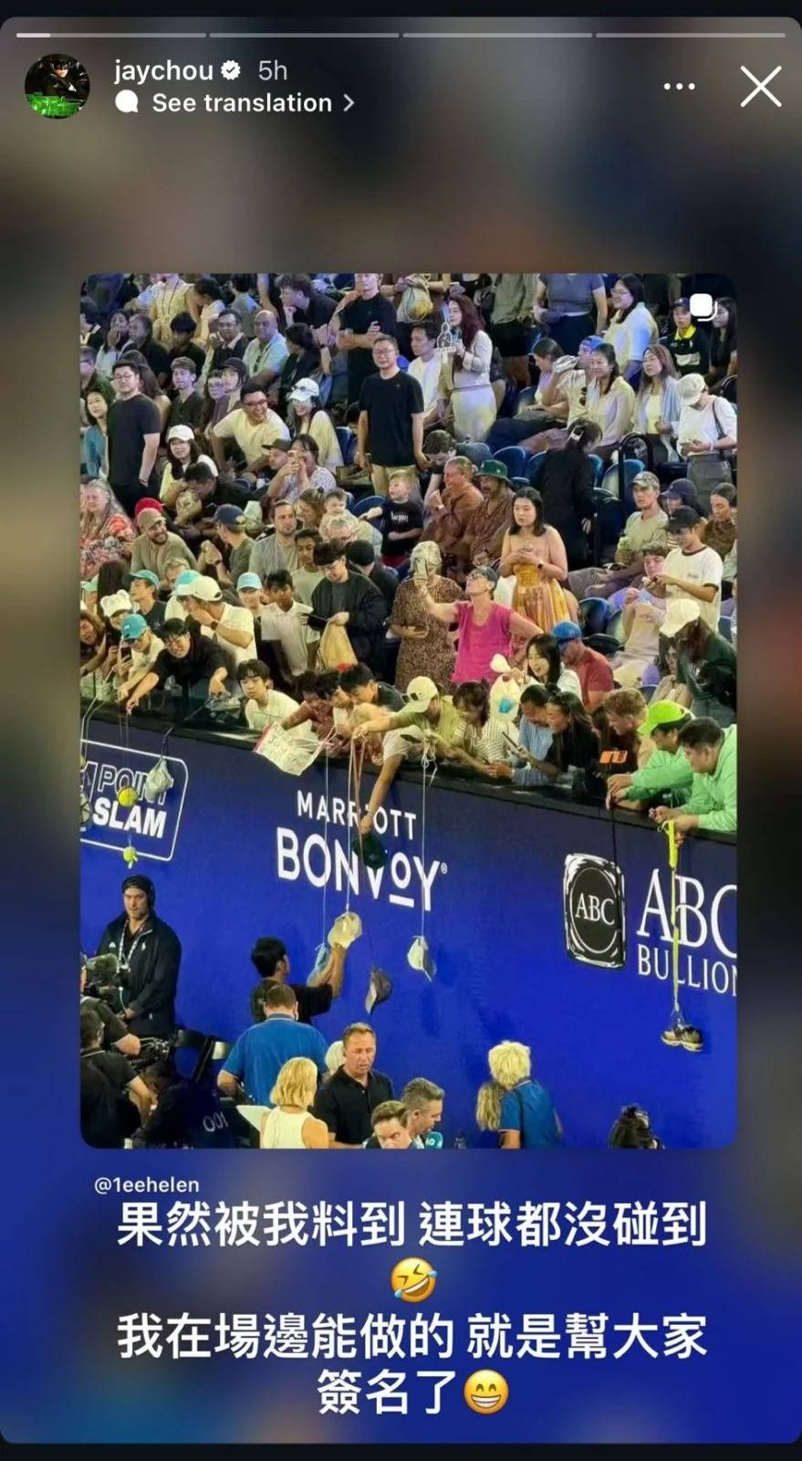 賽後,周杰倫在社交媒體上幽默分享這次經歷,寫道「果然被我料到,連球都沒碰到」,又自嘲「too easy」,並開玩笑說「以後除了練球,還要練剪刀石頭布,贏的選發球」。他還風趣地表示,自己在場邊的最大作用就是為粉絲簽名,展現了天王級的幽默感。最後,他附上一張在賽場邊握拳打氣的帥氣照片,寫下「繼續努力」四字,展現絕佳的運動家精神和積極態度。這種自嘲式的回應方式不僅化解了失敗的尷尬,更讓粉絲看到他可愛的一面。