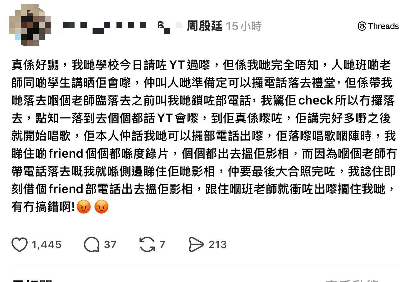該名網民在Threads詳細描述事發經過,表示學校當日請來YT但事前完全沒有通知學生。他指出其他班級的老師早已告知學生YT會到訪,更鼓勵學生準備手機到禮堂拍攝,但帶領他們班級的老師卻在臨出發前要求學生將手機鎖起。該學生因擔心老師檢查而沒有攜帶手機,豈料到達禮堂後才發現所有人都知道YT會來訪。當YT開始表演並表示學生可以拿出手機拍攝時,該學生只能在旁邊眼巴巴看著其他同學錄影和拍照。最令他憤怒的是,當大合照結束後他嘗試借用朋友手機與YT合照時,老師們卻突然衝出來攔阻,令他徹底錯失機會。