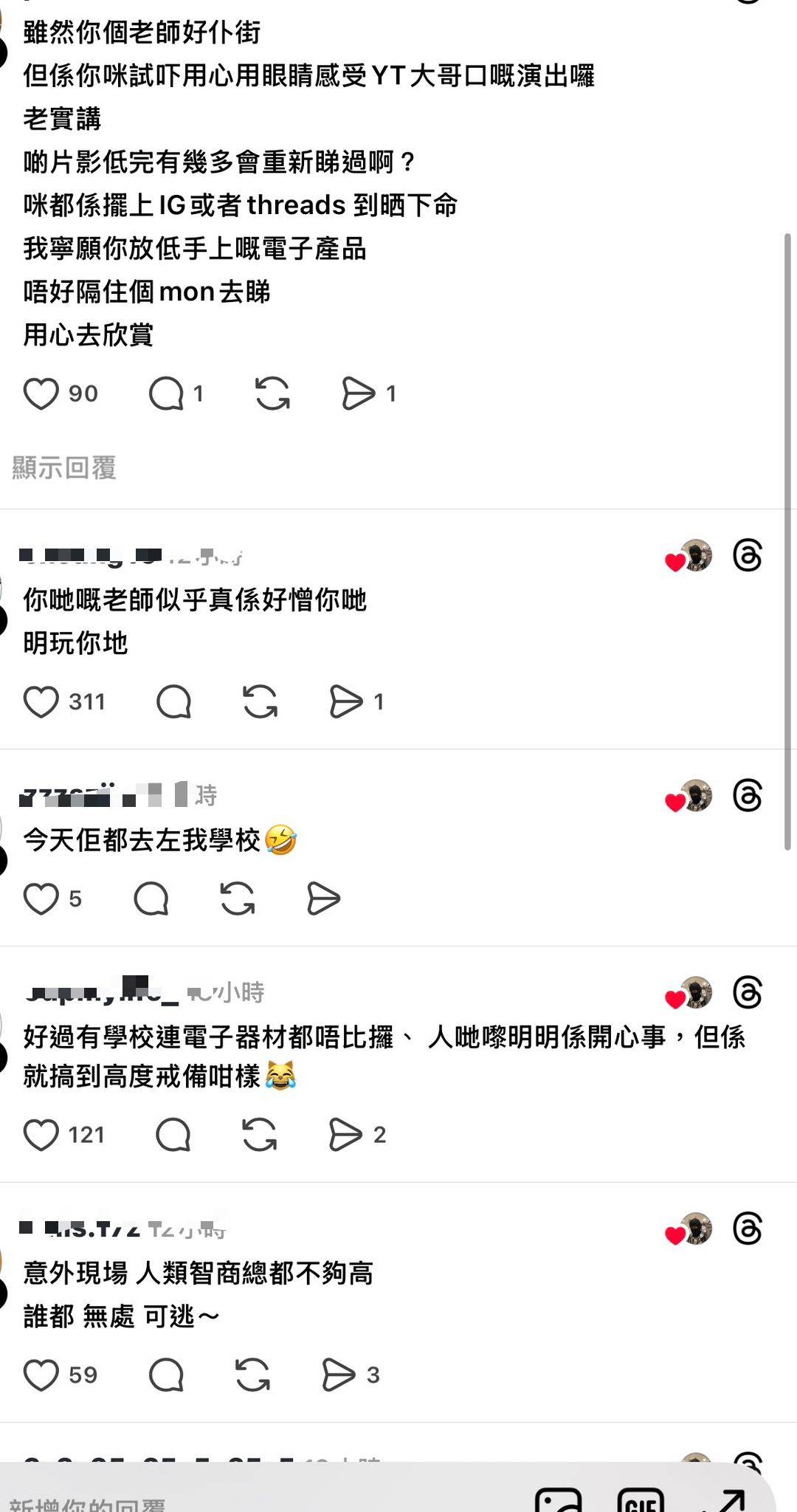 這個投訴帖文迅速引起網民共鳴,大量留言聲援該名學生並痛批老師的雙重標準做法。網民深有感觸地表示:「我希望大家不要覺得會這樣做的老師就一定是年紀大,好多時候心地唔好同年紀真係無關係」,更透露自己經常聽到一些老師在飯桌上數說學生是非,但因害怕影響人際關係而選擇忍氣吞聲。另有網民直接質疑該老師是否「好古老石山嗰種人」,亦有網民建議學生可以作出投訴,認為老師的行為過分。不過亦有網民以較為理性的角度分析,認為該學生的憤怒情緒可以理解,並表示「佢無做錯,你嬲都岩,人生就係咁」。有網民更透露自己的子女同樣遇到類似情況,沒有攜帶手機到場,但慶幸來訪的並非孩子最喜愛的藝人。