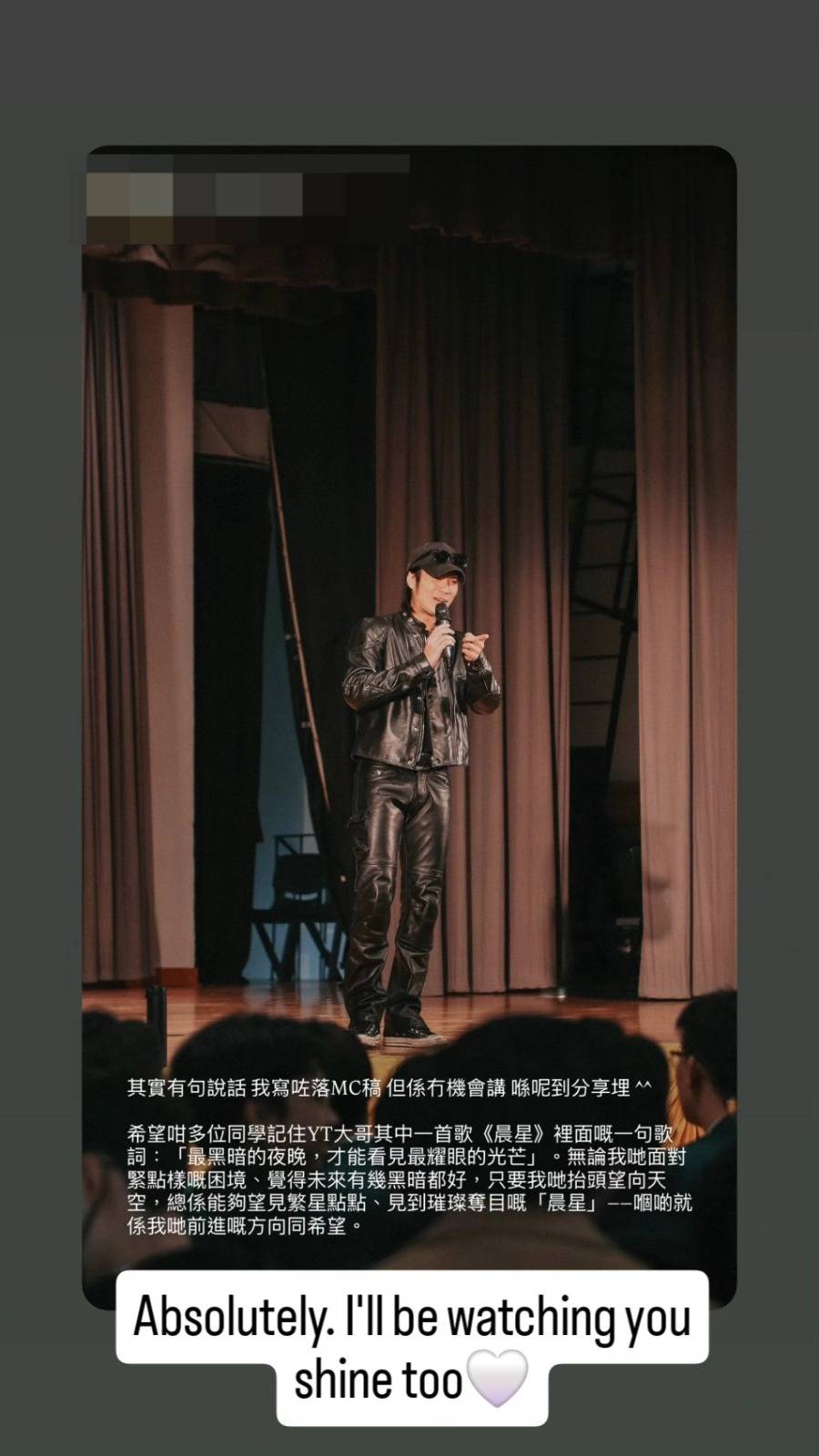 據了解,YT的School Tour義演計劃已獲得超過200間學校邀請,他承諾只要學校提出邀請就必定前往分享。這個為期一年的計劃源於一年前一位女學生的故事,該學生原本不想讀書,但在YT鼓勵下重新振作並成功考上大學,令YT深受啟發決定展開全港校園巡迴。在首站中華基督教會扶輪中學的分享會上,YT不但分享奮鬥經歷,更獻唱歌曲《晨星》並邀請校長合唱,氣氛熱烈。他更在活動結束前承諾將來會在紅館舉行演唱會,與學生們「紅館見」。