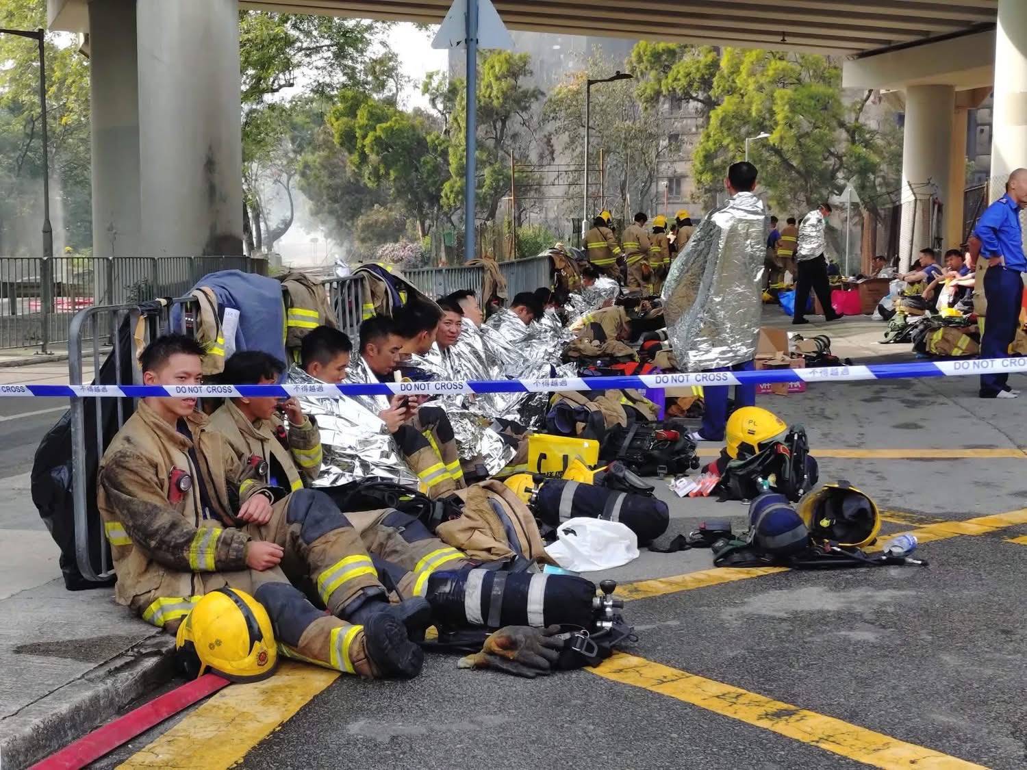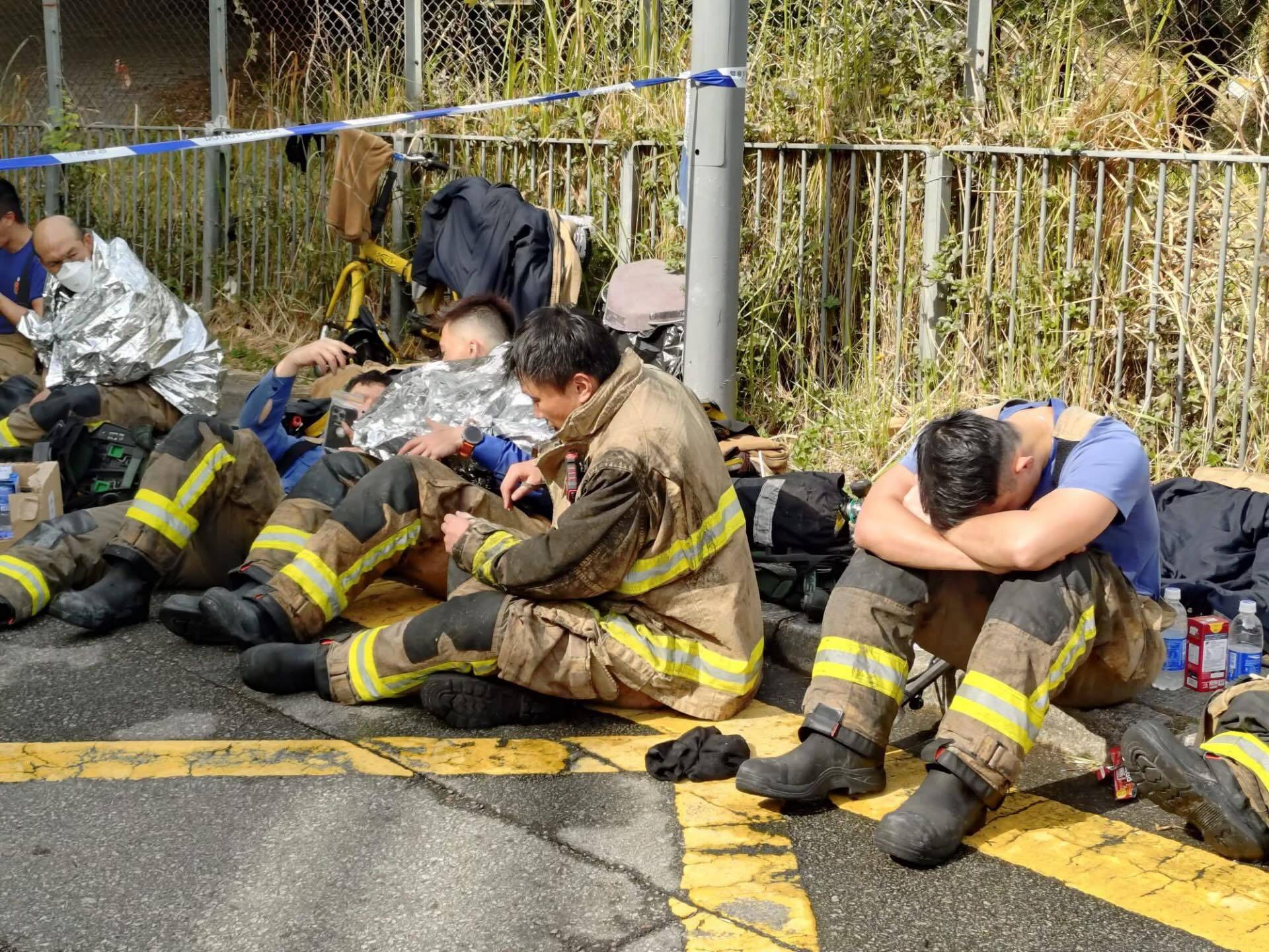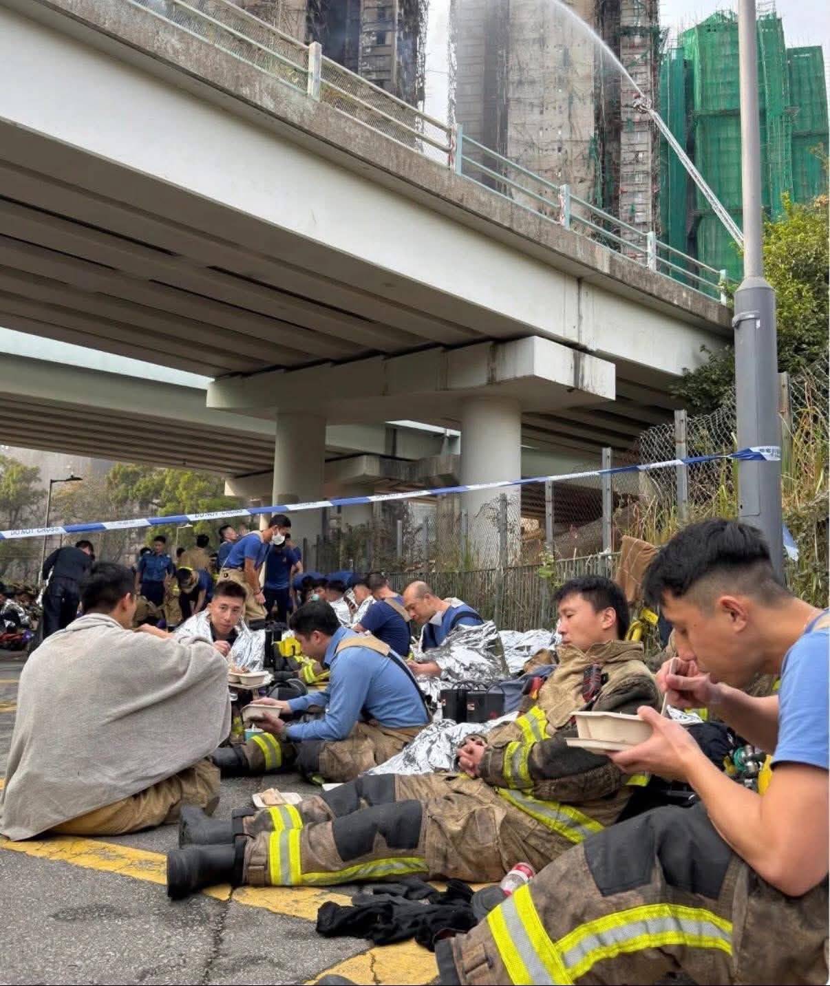 消防指起火7座大廈中,4座已大致救熄,3座火勢有效控制。消防員們爭分奪秒進行滅火及救援行動,除了將生還者交由救護車送院救治外,其中1名消防員更於宏建閣救出9貓1狗。有市民於社交平台晒出捕獲消防員們的「喘息」一刻,畫面中可見消防員們明顯疲憊不堪,即使能夠休息片刻,也沒有即時胃口進食。