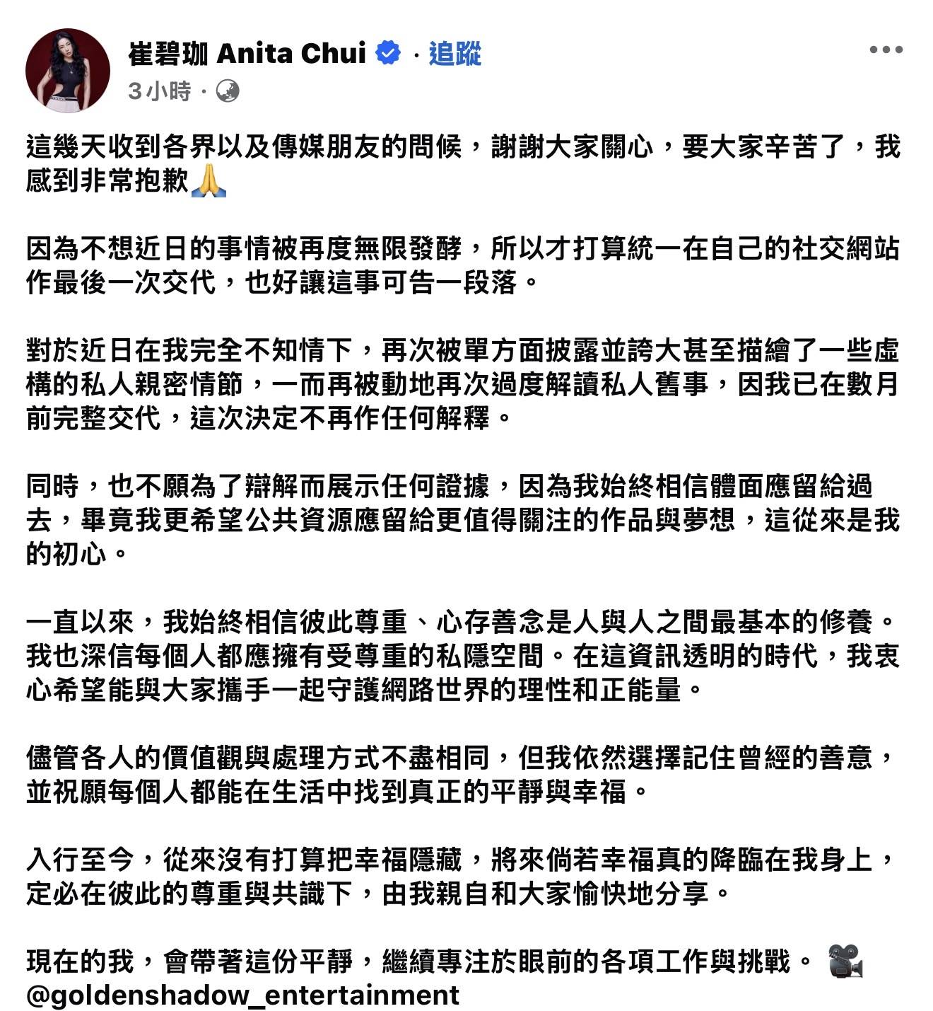 崔碧珈在IG Story上載黑白短片,身穿性感華麗晚裝配上巨型閃鑽,在兩名外籍工作人員協助下整理裝容,似乎正準備出場活動。她表明不想事情無限發酵,所以選擇在社交網統一回應,強調這是首次亦是最後一次。崔碧珈在長文中寫道:「對於近日在我完全不知情下,再次被單方面披露並誇大甚至描繪了一些虛構的私人親密情節,一而再被動地再次過度解讀私人舊事,因我已在數月前完整交代,這次決定不再作任何解釋也不願為了辯解而展示任何證據。」