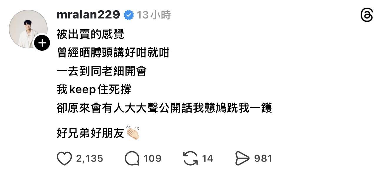 Alan更進一步爆料自己曾經被隊友出賣的經歷,他形容「曾經晒膊頭講好咁就咁,一去到同老細開會,我keep住死撐,卻原來會有人大大聲公開話我戇X跣我一鑊好兄弟好朋友」。這番話暗示在與唱片公司的會議中,有隊友當面背叛他,令他感到被好友出賣的痛苦。Alan質問當他在努力寫歌的時候,其他隊友卻在發展自己的單飛事業,但要求他將創作成果無條件分享給大家。