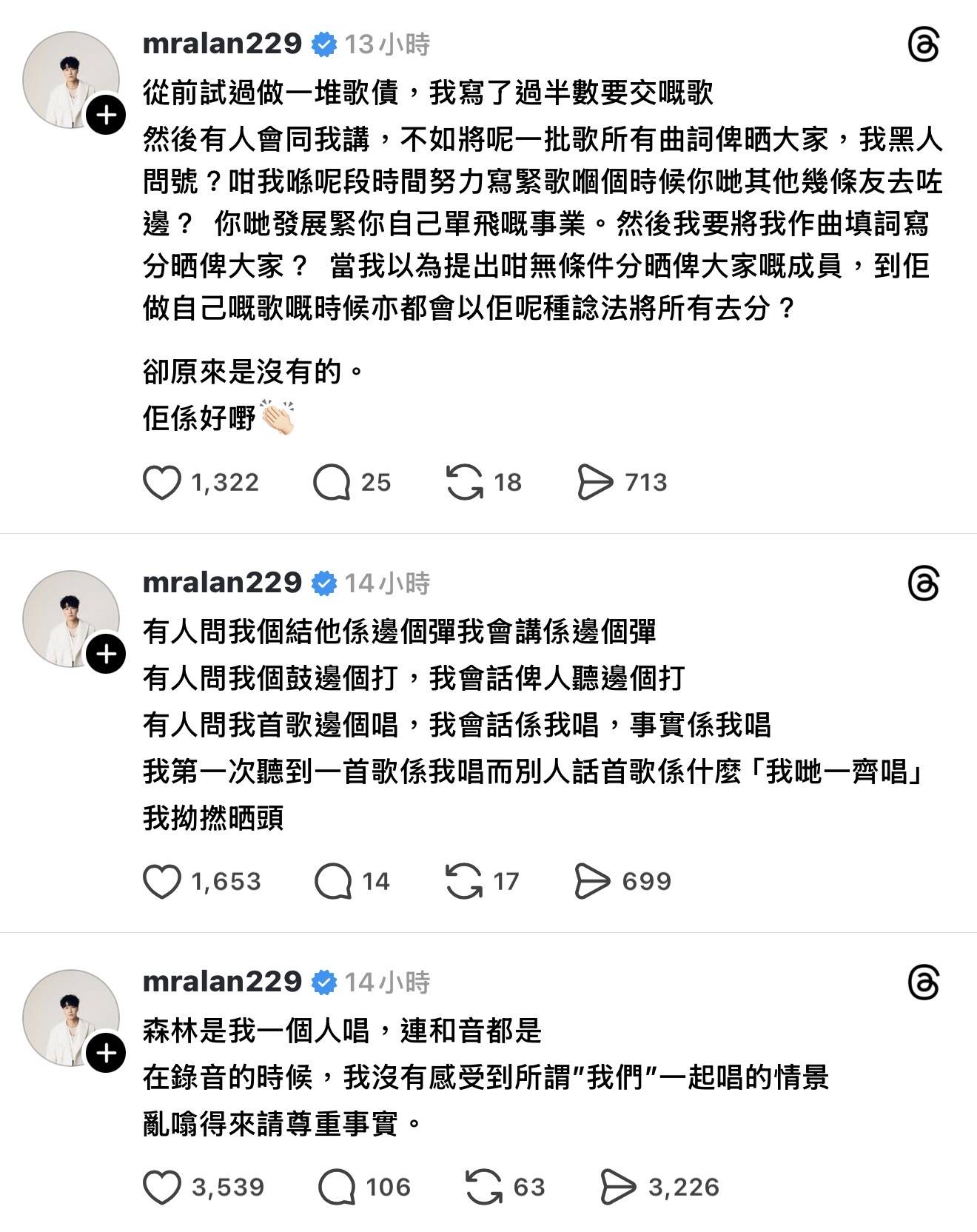 Alan於凌晨在Threads先分享入行多年最滿意的作品,10多分鐘後便開始不點名炮轟幾位Mr.舊隊友。他直言「森林是我一個人唱,連和音都是在錄音的時候,我沒有感受到所謂『我們』一起唱的情景,亂噏得來請尊重事實」。Alan更表示只要有人問誰負責彈結他、打鼓、唱歌,他會說清楚,「我第一次聽到一首歌係我唱而別人話首歌係甚麼『我哋一齊唱』,我拗X晒頭」。