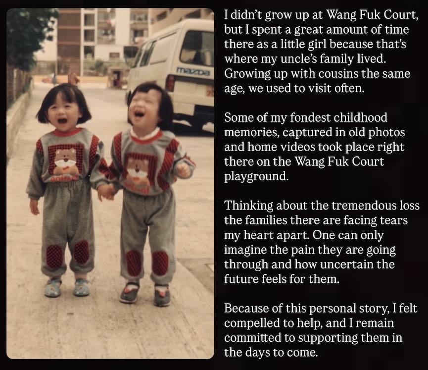 徐天佑太太Olive雖然並非在宏福苑長大,但童年時光大部分都在該處度過,與親友留下無數珍貴回憶。她表示「我細個嘅時候喺嗰度,渡過了好多好開心嘅日子,以前叔叔嬸嬸以及和年紀相若嘅cousins住嗰度,所以經常入去玩。童年最美好嘅回憶,那些舊照片同home video捕捉到嘅片段,好多都係喺宏福苑樓下遊樂場發生。」由於仍有親友居住在屋苑,她對災民遭遇感同身受,「只要一諗起災民們而家經歷緊嘅一切痛苦同遭遇,真係好痛心,面臨心如刀割嘅損失,以及對未來感到徬徨與恐懼,令人心碎。」