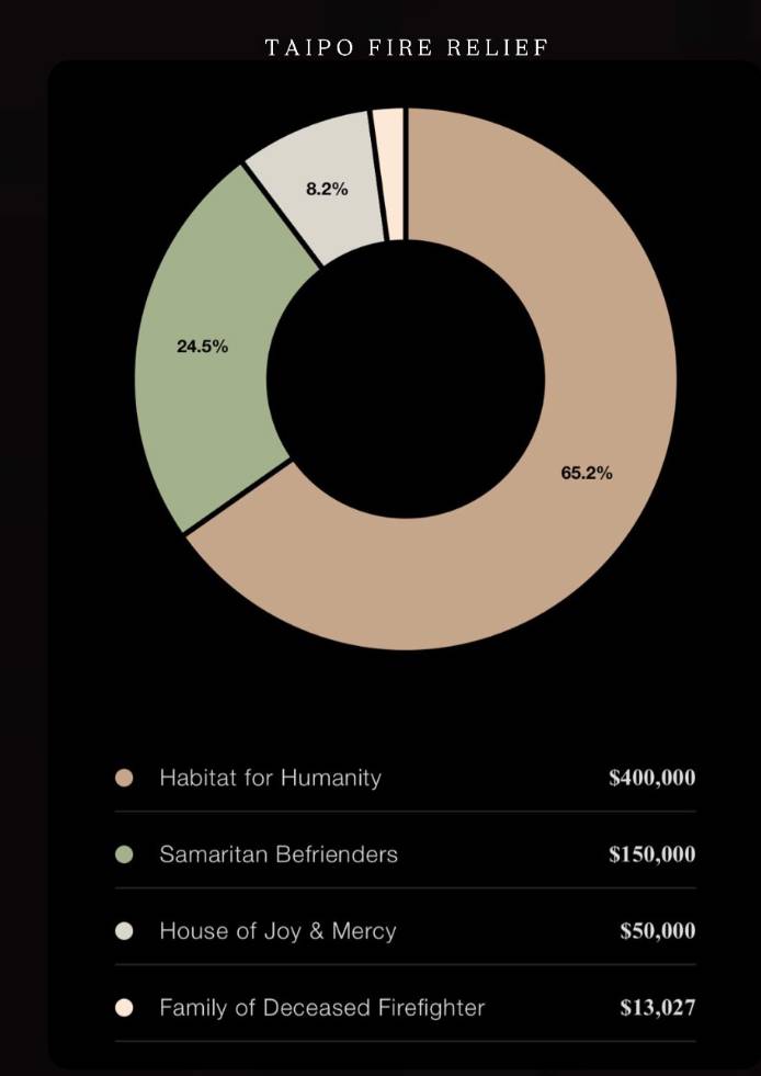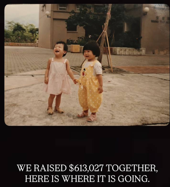 徐天佑夫婦在大火發生後,隨即宣布將護膚品牌概念店「I Never Use Foundation」由11月26日至30日的零售銷售總額全數捐出。今日他們在社交平台公布具體捐款數字,並詳細說明分配方式。夫婦坦言「當我哋宣布將捐出11月26日至30日期間100%的零售總銷售額時,我哋知道係一個重大嘅決定。坦白說,613,027元,並不是額外利潤或marketing budget,這是我哋嘅營運現金流,足以支付我哋一個月的租金和開支,還未計人工。但此刻,災民嘅需要比我哋自身更為迫切。」