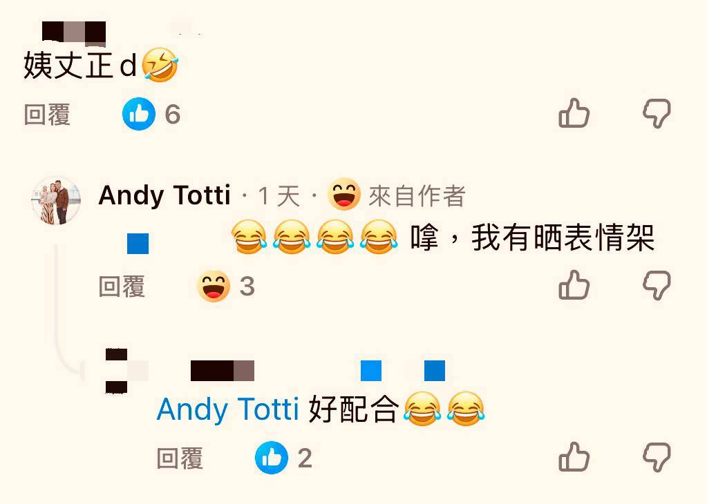 出嚟影,真係天下太平了」而徐蒨寧的老公Andy竟然親自在留言區現身力挺,幽默地表示「嗱,我有曬表情架」,有網民留言「姨丈正d」、「好配合」等。
