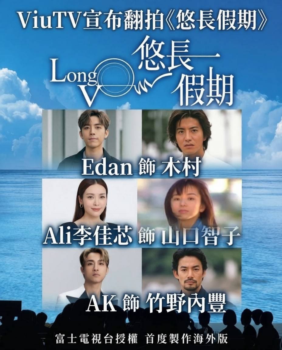 ViuTV今日舉行《ViuTV 10周年午宴》,活動上宣布已成功取得日本富士電視台授權,將開拍港版《悠長假期》,為觀眾重塑呢套愛情經典。現場公布的演員陣容掀起全場高潮,男主角「瀨名秀俊」將由呂爵安(Edan)飾演,而女主角「葉山南」則破天荒由視后李佳芯擔綱!至於另外兩個經典角色,江𤒹生(AK)將會飾演原版中竹野內豐的角色,而COLLAR成員Ivy So蘇雅琳則飾演松隆子的角色,卡士配搭極具話題性。