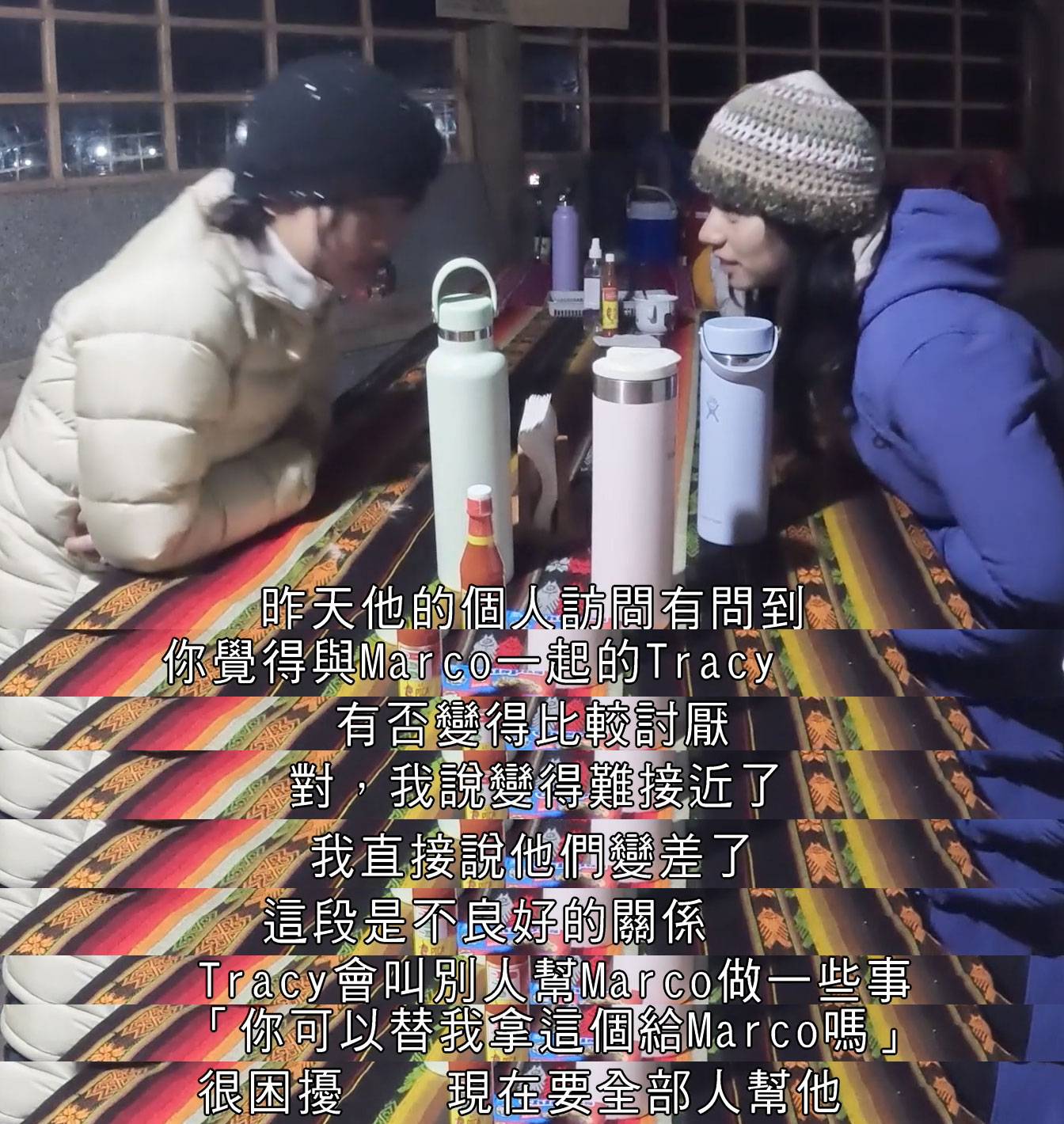 Marco同Tracy原本在上山前都非常恩愛,更討論要在回程時候一起改機票,誰知在行山過程中關係急轉直下。Marco突然同Cleo邊行邊聊天,完全無視Tracy被Wade打到鼻子、弄傷腳時需要關心,令Tracy非常不滿。Tracy忍不住表示「你行開都可以講聲」,但Marco就辯稱自己沒有機會向Tracy講自己會行開,兩人因此爆發激烈爭吵。網民睇到都替Tracy不值,紛紛留言「Marco呢個行為真係好自私」、「Tracy受傷都唔理,仲有咩好講」;不過亦有網民認為Tracy太想控制Marco。