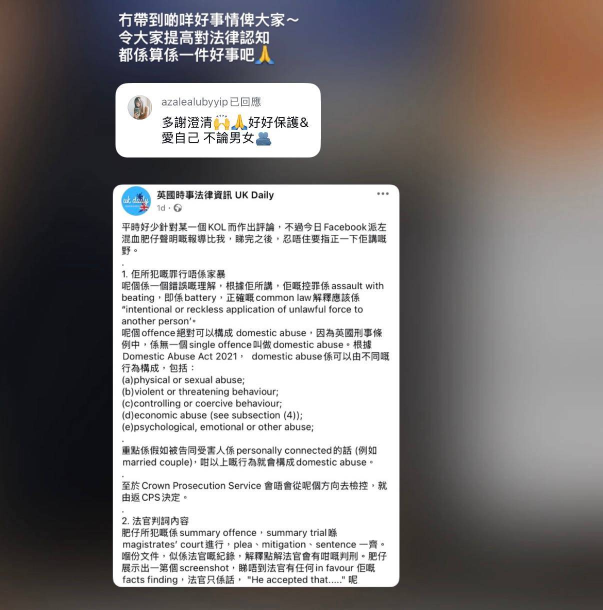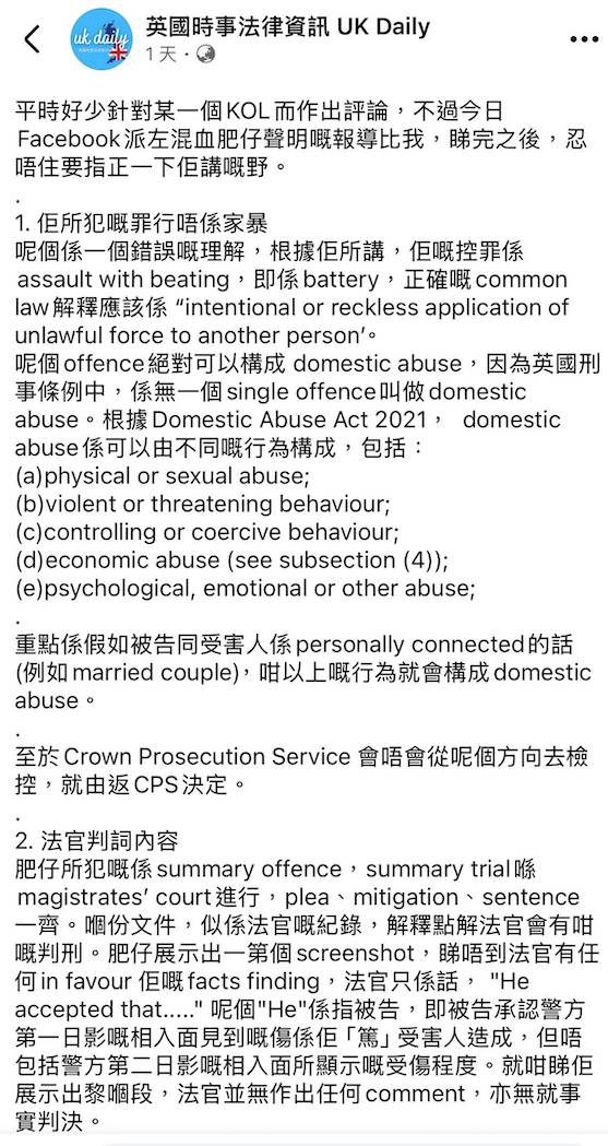 混血肥仔否認家暴遭英國法律專頁狠批 列3大破綻反駁 獲芊蕙子轉發