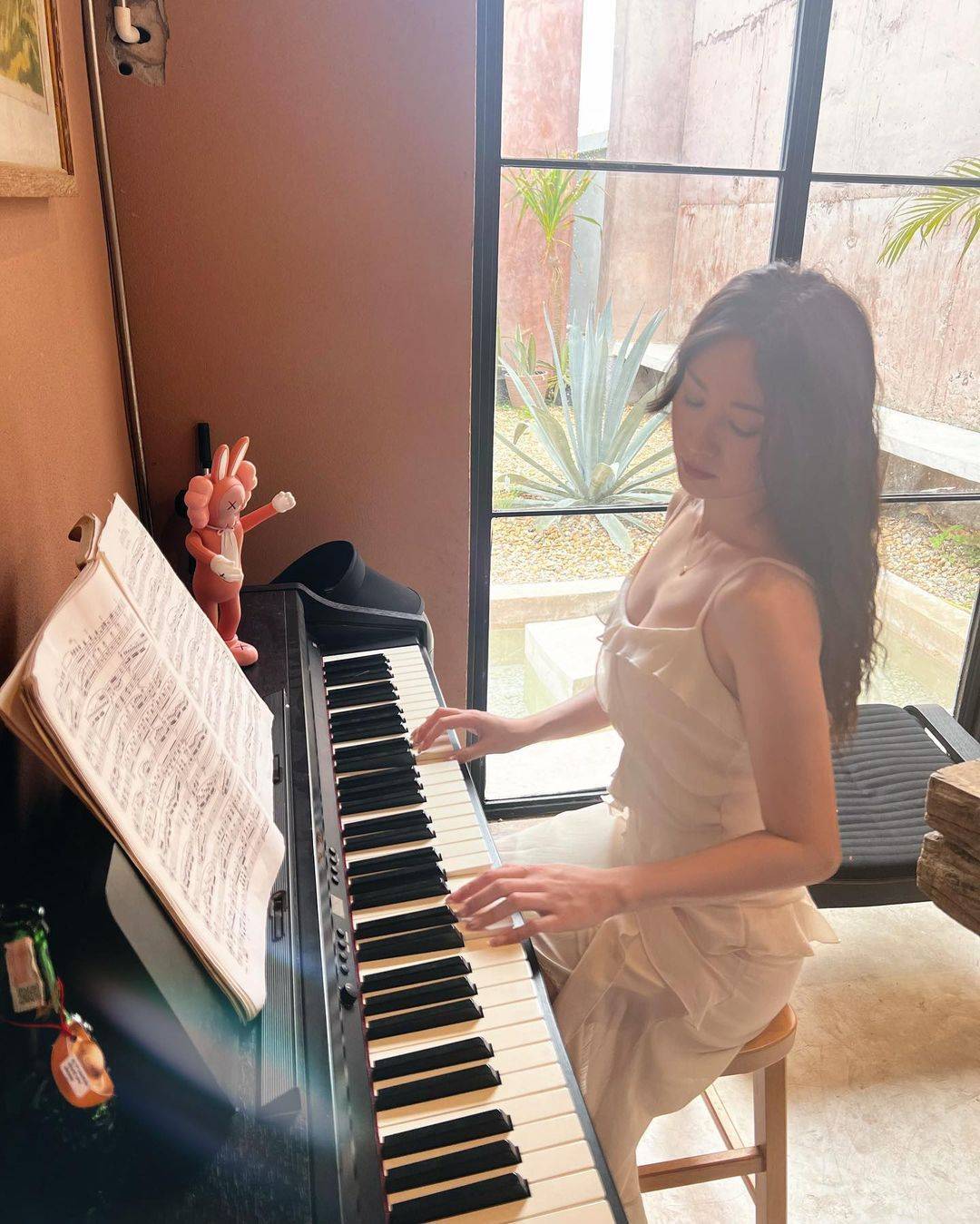 朱晨麗彈琴時展現出深長事業線,但崔建邦竟然「錯重點」,留意她身後落地窗外的背景。(圖片來源:IG@rebecca_zhu)