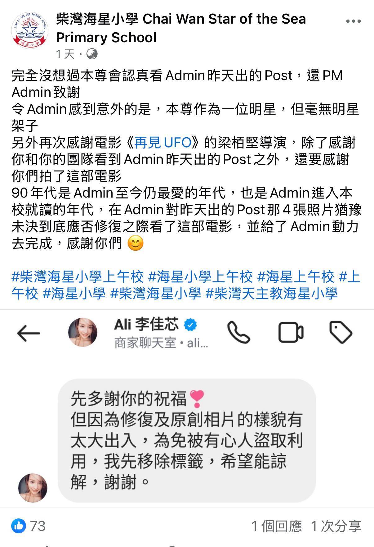 儘管照片引起小風波,但同學之間的真摯友誼卻令人感動。Admin在帖文中提到,佳芯當年的同窗已表示屆時會留守家中電視機旁為她打氣,可見同學之間的感情並未有隨時間沖淡。管控員更直呼佳芯真名「李嘉馨」,相信當事人應該覺得分外親切,這份來自母校的溫暖支持,相信會成為Ali在金像獎台上的最大動力。