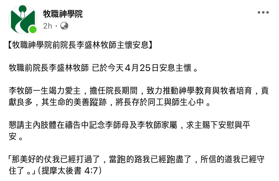 李盛林牧師曾任院長嘅牧職神學院今日喺社交平台公布其死訊,證實李牧師已安息主懷。院方喺公告中寫道:「牧職前院長李盛林牧師 已於今天4月25日安息主懷。李牧師一生竭力愛主,擔任院長期間,致力推動神學教育與牧者培育,貢獻良多,其生命的美善蹤跡,將長存於同工與師生心中。」院方亦懇請各界為李師母及家人禱告,並引用聖經經文作結:「『那美好的仗我已經打過了,當跑的路我已經跑盡了,所信的道我已經守住了。』」,字裡行間流露無限追思。