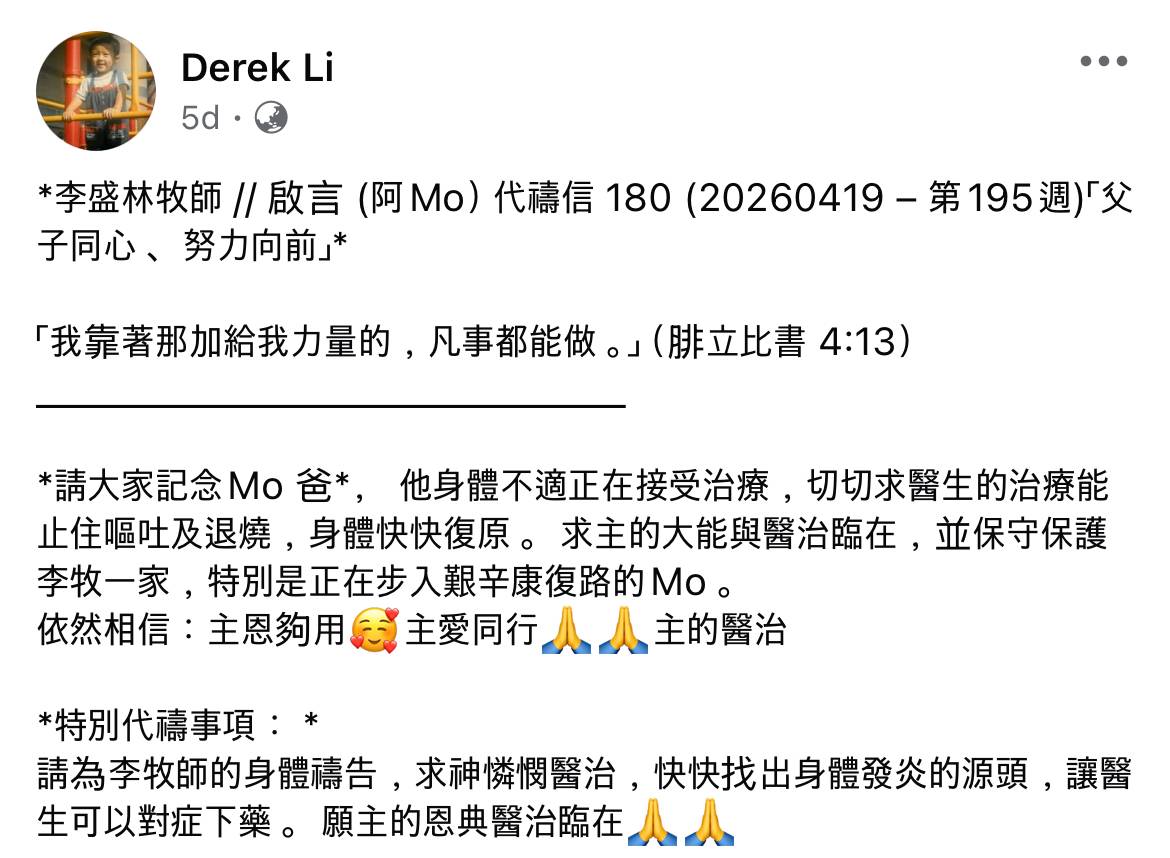 喺嗰封延遲發出嘅代禱信中,李盛林牧師更剖白咗內心最深處嘅三個恐懼,包括「不確定自己的身體能否支撐、不確定自己還能陪兒子走多長的路、不確定未來的日子會如何展開」,字字句句都係對兒子未來嘅擔憂,父愛之情溢於言表。佢更寫下一句令人心酸嘅說話:「一封遲來的信,讓我們看見:原來,一直撐著這個家的人,也需要被撐住。」早前佢亦曾因發燒嘔吐入院,相中見佢手臂插滿喉管,可見照顧者身心承受嘅巨大壓力。
