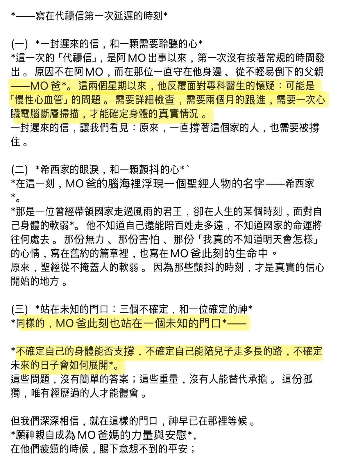 事實上,李牧師嘅健康狀況早有預兆。喺過去近兩年時間,李牧師風雨不改每週撰寫代禱信,向外界交代阿Mo嘅最新情況。但喺今年3月,佢首次延遲發信,並以「寫在代禱信第一次延遲的時刻」為題,罕有地提及自己嘅身體狀況,透露「可能出現慢性心血管的問題」,需要進行詳細檢查及追蹤觀察,當時已引起外界關心。估唔到事隔僅一個月,就傳來不幸消息,實在令人難以接受。