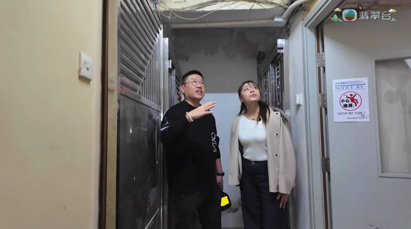 主持俞可程採訪新蒲崗一幢樓齡逾60年的唐樓近日爆出嚴重滲水問題,其白衫造型引起網民關注。(圖片來源:TVB)