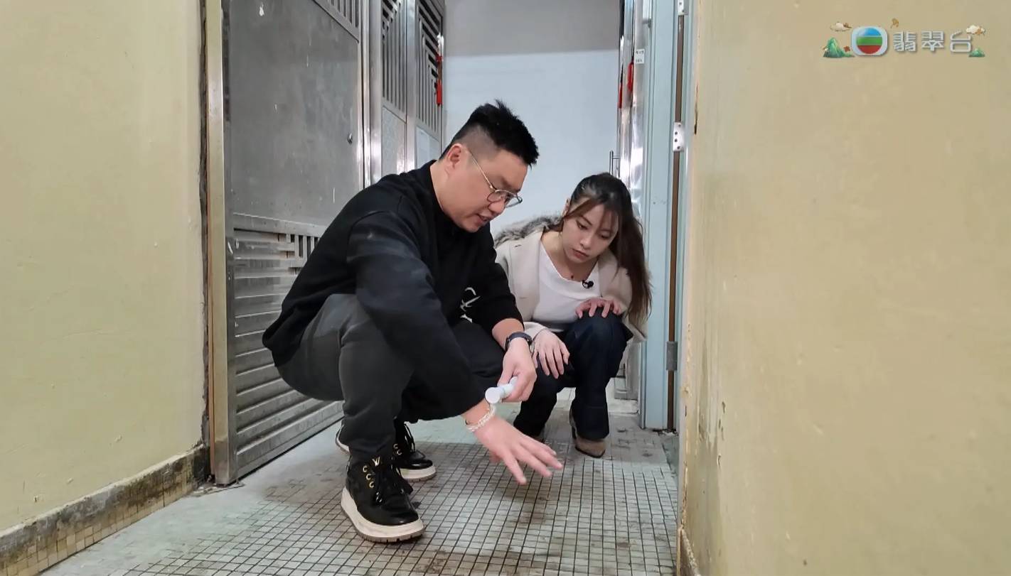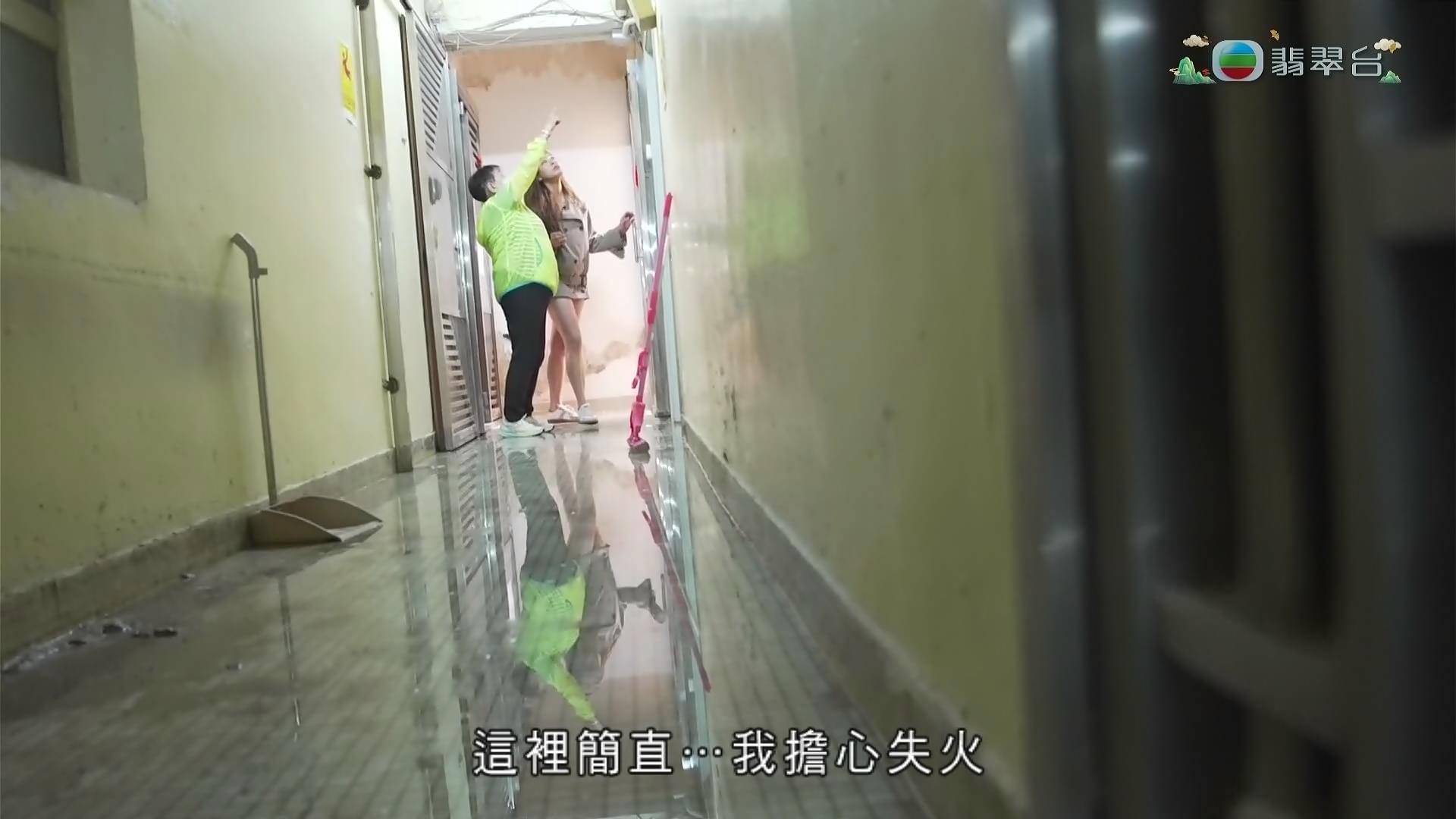 東張西望 俞可程 走廊地面濕滑出現積水,住戶出入需格外小心。(圖片來源:TVB)