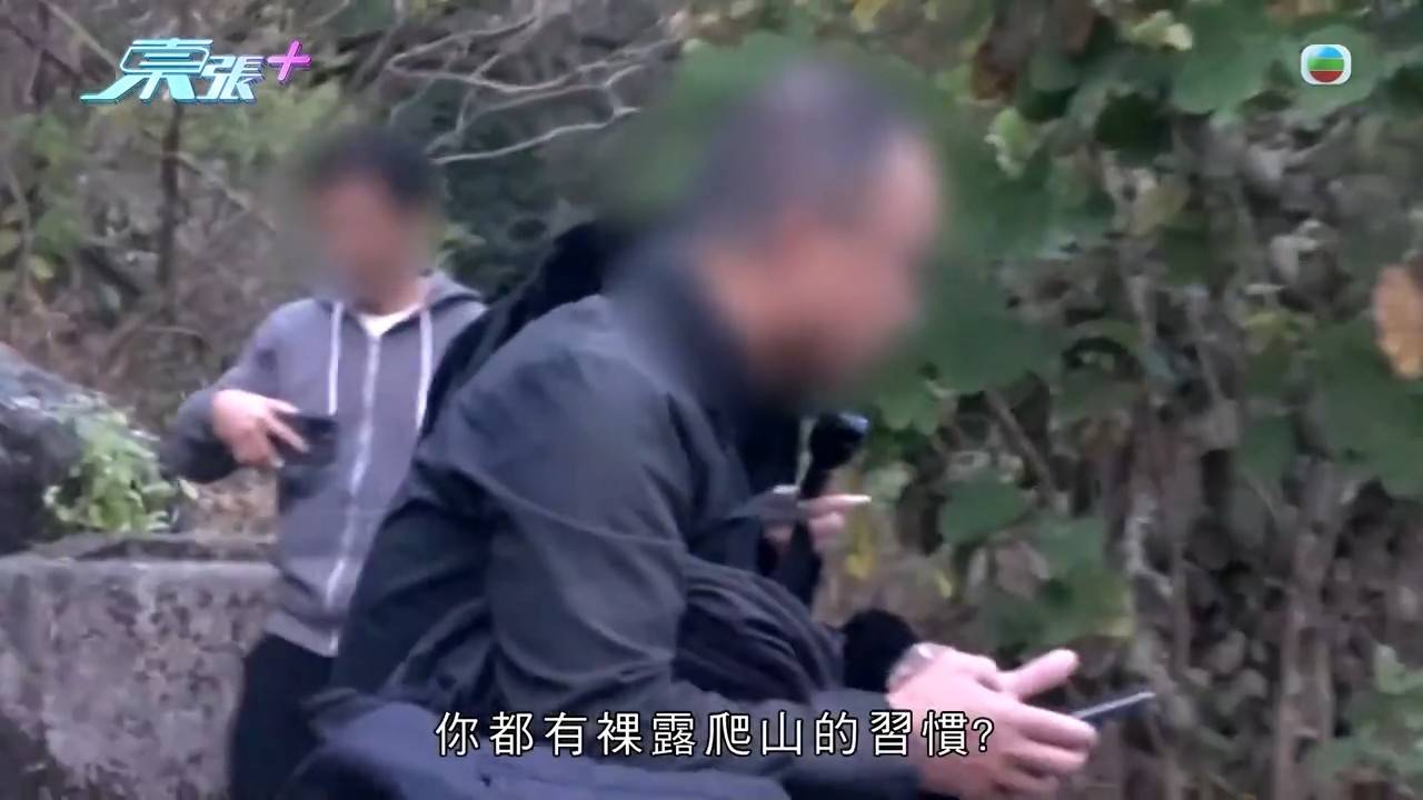 攝製隊跟隨街坊線索,在山上找到疑似山系裸男搭建的臨時居所。這個帳篷用竹枝和綠色帆布搭成,現場設有山寨版供水系統,還有一條晾曬的毛巾。據街坊透露,山系裸男經常在此全裸沖涼,完全不顧及可能被人看見的尷尬。現場還發現一些裝有餅乾的鐵罐,顯示他可能長期在此棲身,將這裡當作自己的秘密基地。緣份終於來到,攝製隊在另一日成功遇到山系裸男。在他脫光衣服前,東張主持黎寬怡把握機會埋身追訪,詢問他為何多年來有裸體行山習慣,但對方只回應「係咩」兩個字。貓仔鍥而不捨地追問:「點解你要咁做?係會開心啲抑或乜原因呢?」、「其實係咩原因有呢個習慣?你知唔知係犯法㗎!」可惜山系裸男始終拒絕回應,急步向山上逃去。