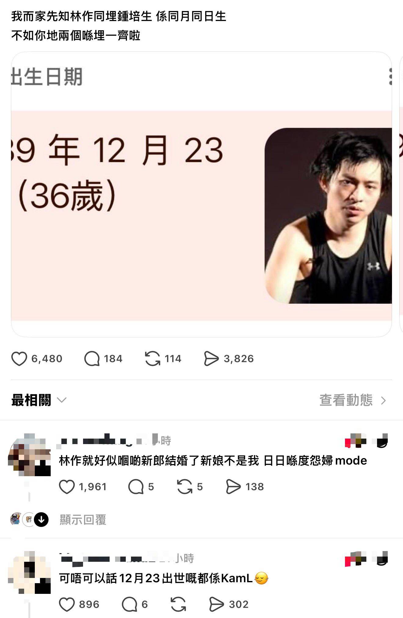 有網民在社交平台分享這個發現後,立即吸引大量留言討論。網民紛紛留言「我而家先知林作同埋鍾培生係同月同日生」,更有人直接建議「不如你地兩個喺埋一齊啦」。討論中最引人注目的是有網民留言「既生作,何生生」,巧妙地改編了三國演義的經典台詞,形容兩人的微妙關係。另外亦有網民表示「仲要只係差一年」,對這個巧合感到不可思議。