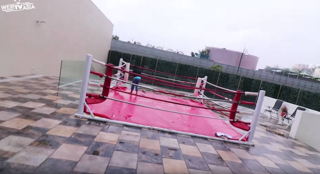 鍾培生鍾情拳擊,於家中花園放咗個標準的擋台,以供平時練習之用。佢亦參加過多場慈善拳賽,相信呢啲經驗對佢打林作相當有幫助。(圖片來源:聖結石 YOUTUBE)