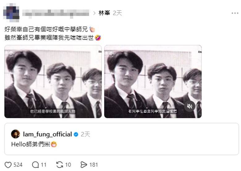令人意外的是,林峯本尊竟然親自在貼文下留言回應:「Hello師弟們!」展現十分親民的一面。網民見到林峯現身都相當興奮,紛紛留言「大王駕到」、「大王師兄」、「靚仔」,更有網民幽默地寫道「原來我師兄係秦始皇」,呼應林峯在《尋秦記》中飾演的角色。這次互動不但讓粉絲感受到林峯的親和力,更勾起不少人的校園回憶。