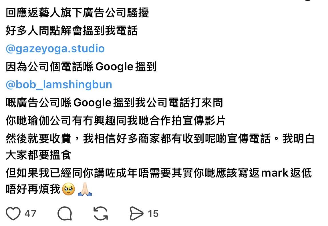 事件源於一名瑜珈中心負責人在Bob的threads帖文下留言投訴,詳細描述被騷擾的經過。她在留言中寫道:「請問你可唔可以叫你公司嘅同事剷除我個手提電話,藝人Bob有一間製作公司,每一個月都搵佢哋不同同事,打兩次電話俾我。話有一個節目合作要俾錢佢哋同佢哋合作拍片,我明白宣傳係要付費,但問題我冇搵佢哋查詢。」這位負責人表示,每次拒絕後對方都聲稱不知道有其他同事曾經聯絡過她,但騷擾行為卻持續了整整一年,令她感到極度困擾。