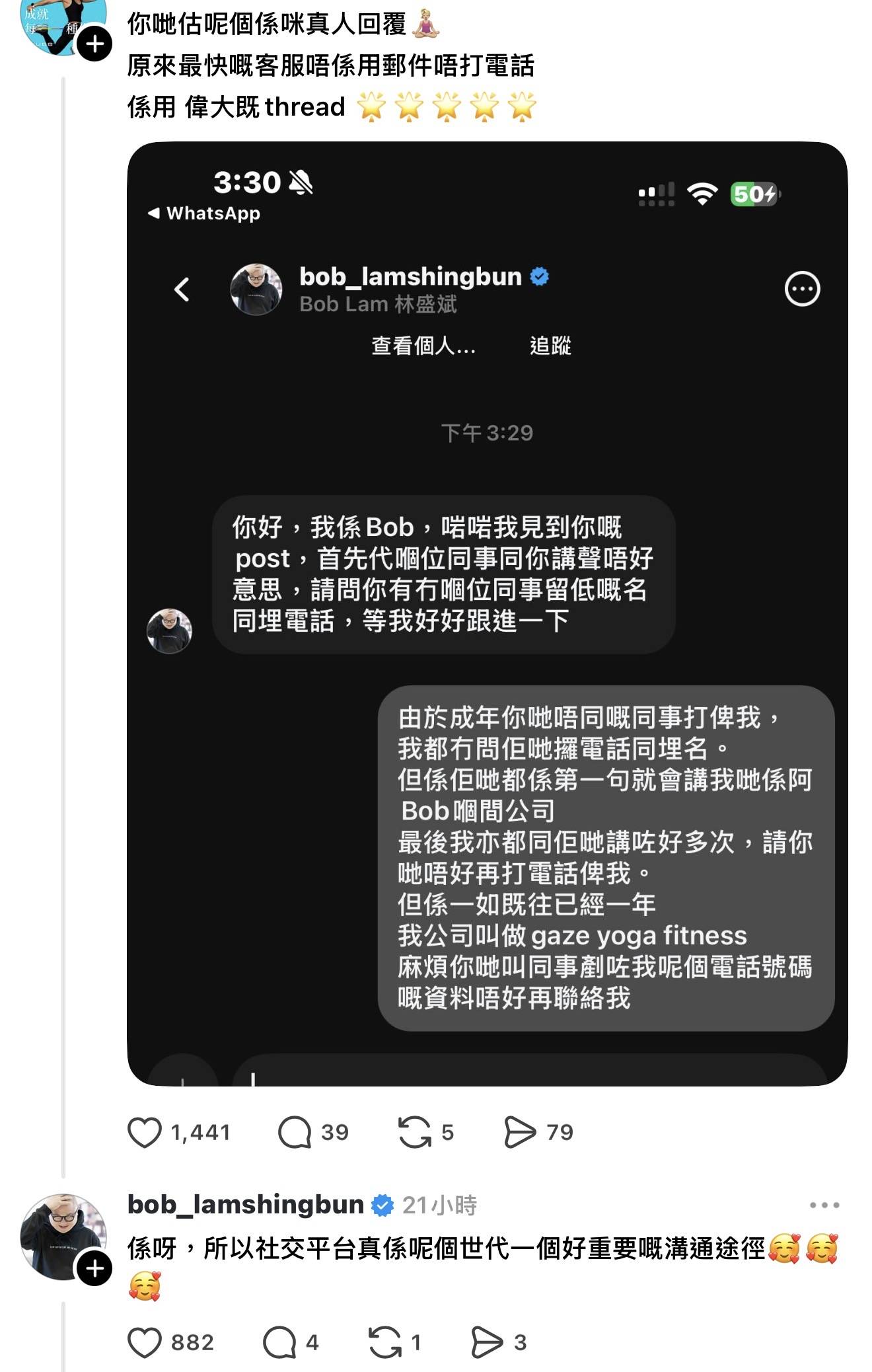 面對公開投訴,Bob迅速作出回應,主動私訊該名瑜珈中心負責人,承諾會「好好跟進一下」事件。投訴人其後公開了與Bob的對話截圖,並在帖文中寫道:「原來最快嘅客服唔係用郵件、打電話,係用偉大既threads!」Bob也在截圖下回應表示:「係呀,所以社交平台真係呢個世代一個好重要嘅溝通途徑。」雖然Bob的回應態度算是積極,但事件已經持續一年才得到正視,令人質疑公司的客戶服務機制是否存在漏洞。