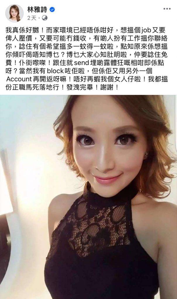 林雅詩昨日在社交平台大吐苦水,詳細講述搵工期間的恐怖遭遇。她表示現時經濟環境不佳,想找工作又要被人壓價,甚至可能沒有收入,正當她以為有希望賺取一分一毫時,卻發現有人假扮有工作機會聯絡她。林雅詩激動地寫道:「有啲人扮有工作搵你聯絡你,諗住有個希望搵多一蚊得一蚊啦,點知原來係想搵你傾吓偈唔知博乜?博乜大家心知肚明啦,仲要諗住免費!」更令她憤怒的是,對方之後竟向她傳送露體相片,她怒斥:「跟住就send埋啲露體狂嘅相,咁即係點呀?」