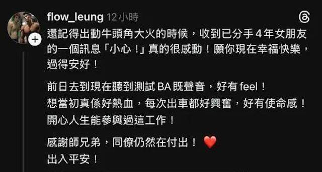 梁裕恆日前在社交平台Threads發文,分享自己曾參與2016年牛頭角迷你倉大火的救援行動,他寫道「還記得出動牛頭角大火的時候,收到已分手4年女朋友的一個訊息『小心!』真的很感動!願你現在幸福快樂,過得安好!前日去到現在聽到測試BA既聲音,好有feel!想當初真係好熱血,每次出車都好興奮,好有使命感!開心人生能參與過這工作!感謝師兄弟,同僚仍然在付出!出入平安!」貼文一出即引起網民強烈反彈,認為他在如此敏感時刻發表相關言論極不合適。