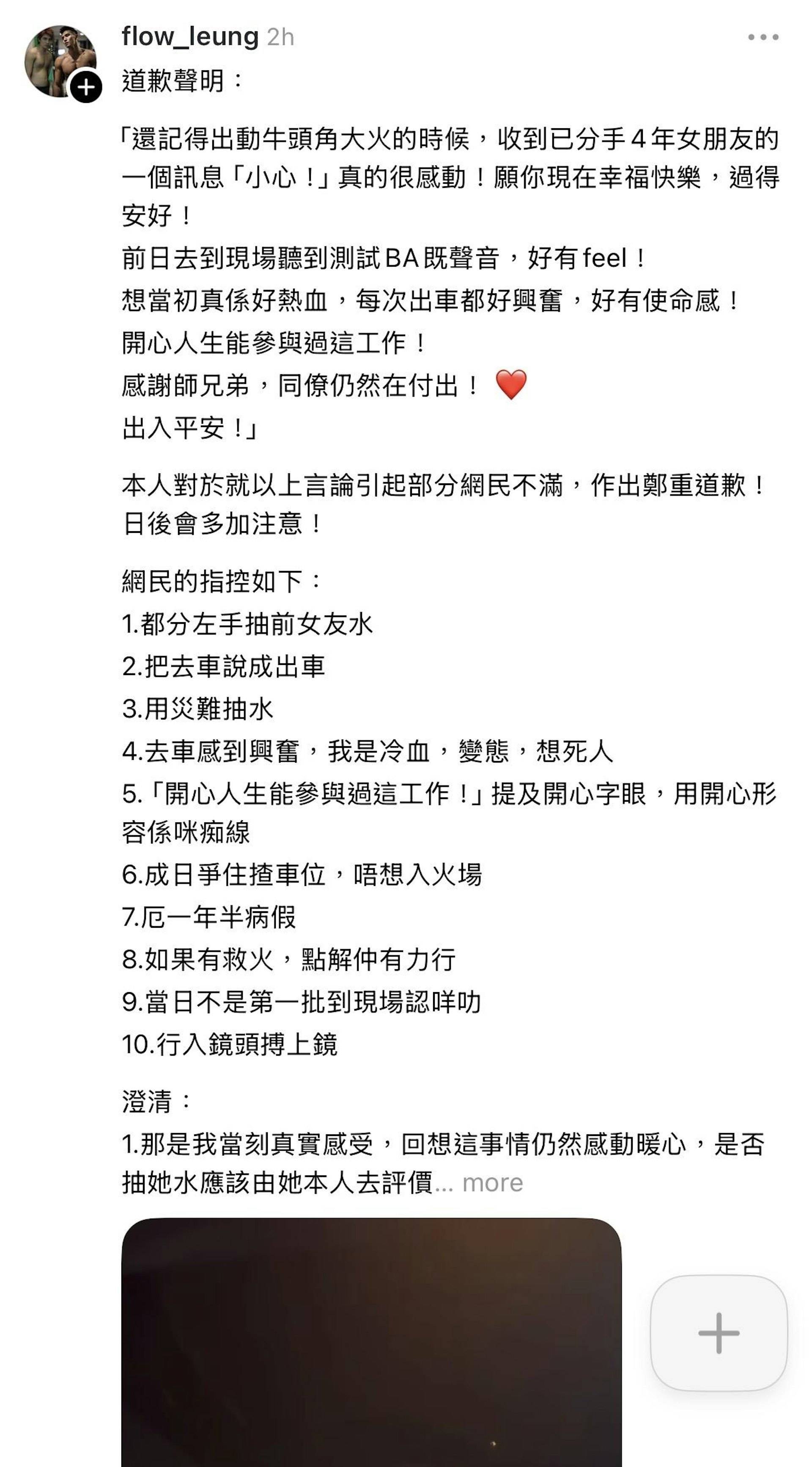 面對網民炮轟,梁裕恆隨即發文道歉,回應網民多10大指控,否認抽災難水,純粹是有感而發:「最初出班去車感到興奮,相信是大部分新仔既感受,我們不是因有事故發生而感到興奮,而是因為訓練了半年,終於可以發揮自己的價值,有能力貢獻,有機會幫人而感到興奮。」強調全文沒有提及保險,並表示自己團隊已講明不可將火災與保險掛勾,試圖澄清外界對他藉災難推銷保險的質疑。