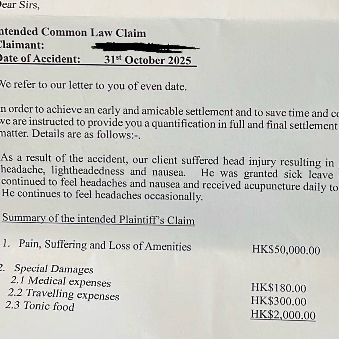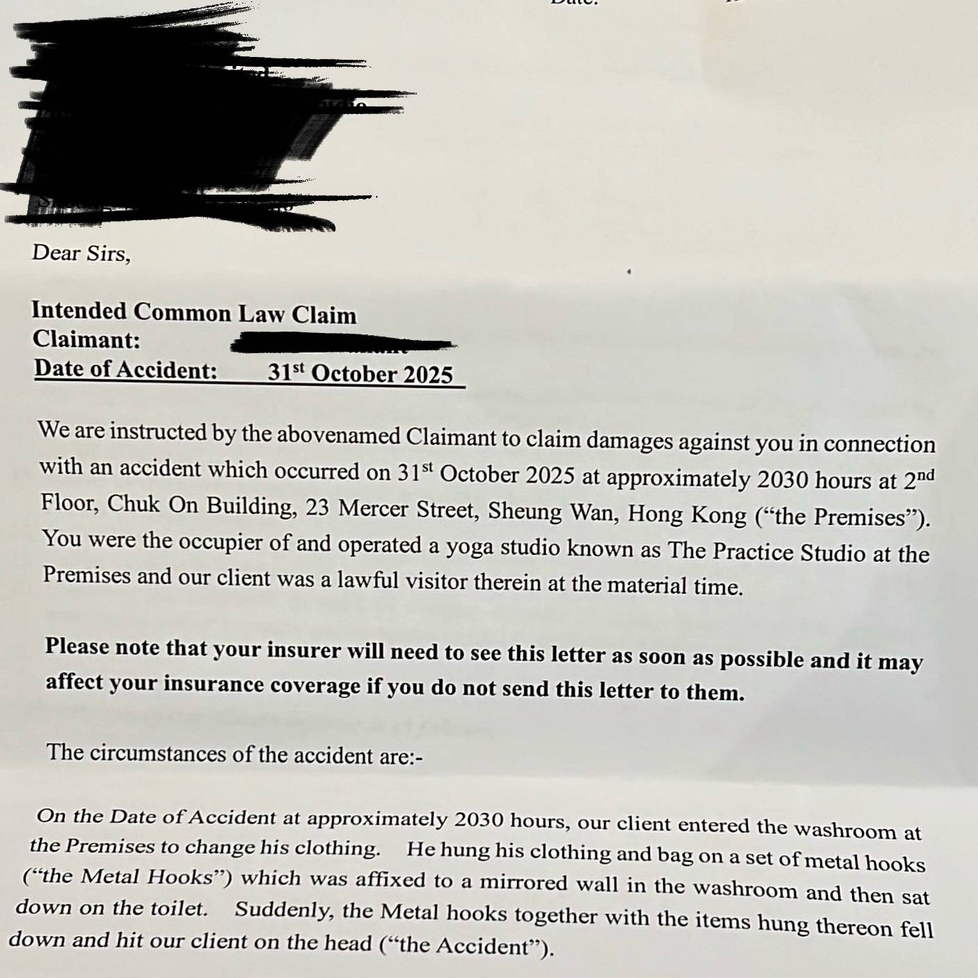 據楊焉透露,傷者的律師女朋友當日亦在場目睹意外,事後主動寄出掛號信提出索償要求。楊焉在帖文中寫道「佢車費、醫生費連埋條友既ID,心靈補償要5萬,件事要claim 8萬」,對於高額索償感到震驚。她強調瑜伽教室內設有大約20個儲物櫃且空間寬敞,該掛勾上方已清楚貼有「不能承重、不能掛袋」的警告標語,告示板也有寫明「自己要照顧自己安全」的提醒。