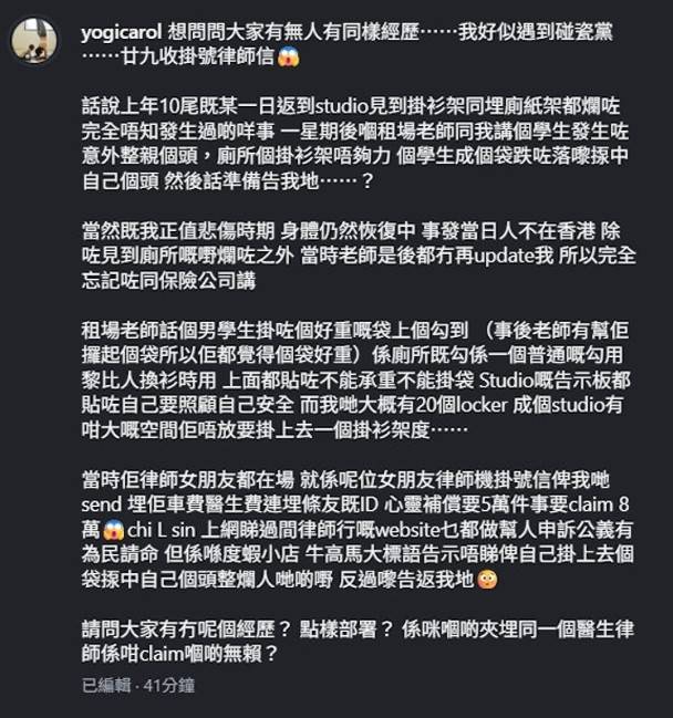 昨日37歲前性感女神楊焉在社交網發文,透露自己開設的瑜伽教室遭學生索償8萬元,事緣去年10月底有租場學生在廁所掛袋時發生意外撞傷頭部,對方律師女友隨即發出掛號信要求賠償。楊焉怒斥對方是「碰瓷黨」勒索,強調現場已貼有警告標語,質疑遇上無理索償。