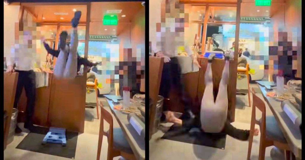 她突然失手,頭部撞向水吧,並在眾目睽睽之下從空中墜落,背部重重地摔在地上(圖片來源:youtube@Carol Yeung)